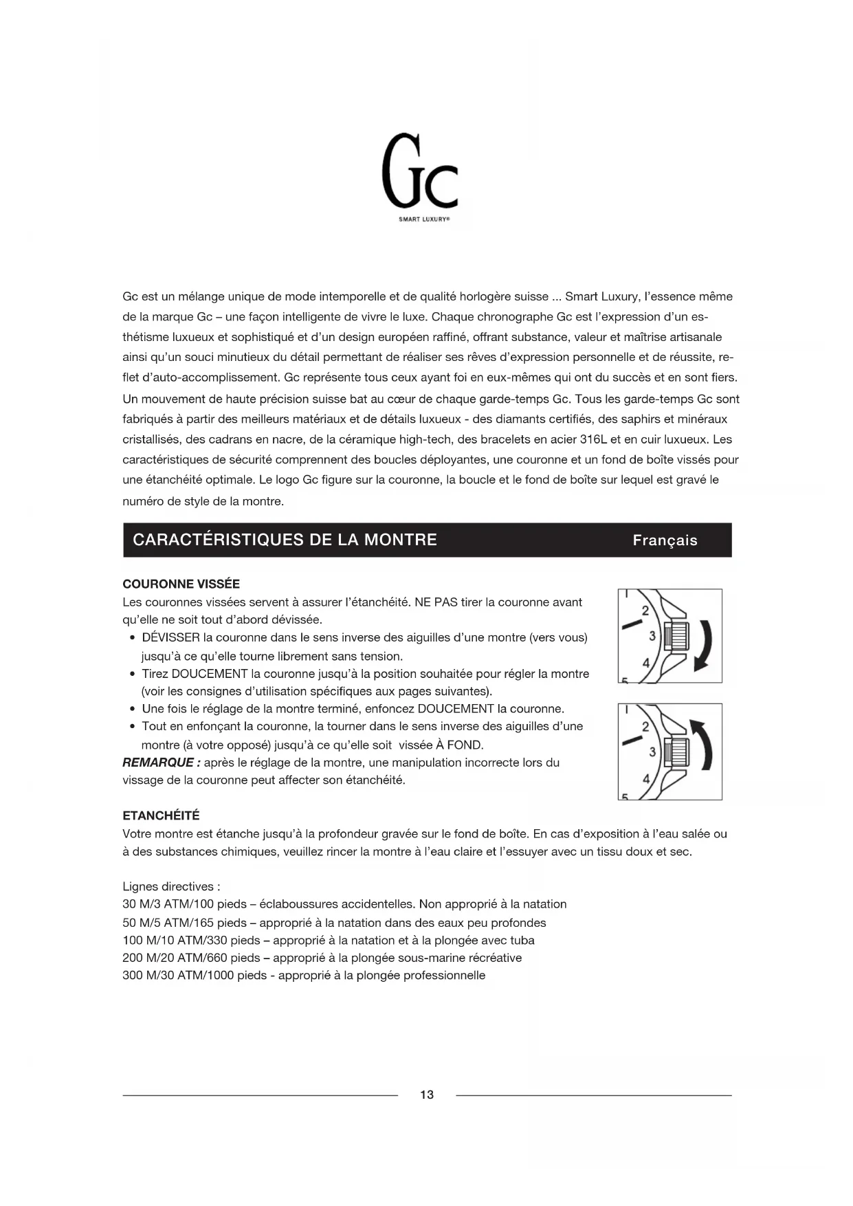 Le chronographe Gc automatique a une couronne vissée. Il est important de la visser correctement et à fond après chaque réglage pour assurer l’étanchéité de la montre. Ne TIRER pas la couronne avant qu’elle ne soit tout d’abord dévissée. DÉVISSER la couronne dans le sens inverse des aiguilles d’une montre (vers vous) jusqu’à ce qu’elle tourne librement sans tension, puis TIRER la couronne jusqu’à la position souhaitée pour le réglage de la montre. Après avoir réglé l’heure, mettre la couronne en position 1, la maintenir dans cette position et la tourner dans le sens des aiguilles d’une montre. La visser à fond. ETANCHÉITÉ Votre chronographe Gc automatique est étanche jusqu’à 100 mètres (pression de 10 ATM/ 330 pieds). En cas d’exposition à l’eau salée ou à des substances chimiques, veuillez rincer la montre à l’eau claire et l’essuyer avec un tissu doux et sec. DIAMANTS Votre garde-temps Gc est confectionné à partir de véritables diamants naturels reètant l’attention que nous portons à la qualité et au design. Les diamants de votre garde-temps Gc achetés auprès de sources légitimes ne proviennent pas de zones de conit d’après les garanties délivrées par le fournisseur de ces diamants. GARANTIE Votre montre Gc est couverte par une garantie internationale contre tous les vices de fabrication pour une durée de 24 mois* à compter de la date d’achat indiquée sur la carte de garantie. Toute pièce défectueuse sera réparée ou remplacée gratuitement pendant cette période. An de bénécier de cette garantie, il vous faudra présenter le certicat de garantie internationale de Gc Watches, dûment rempli, daté, revêtu du cachet et de la signature du détaillant agréé de Gc Watches. LE CERTIFICAT DE GARANTIE INTERNATIONALE GC WATCHES NE COUVRE PAS : - les défauts résultant de dommages, d’une manipulation inadéquate ou d’une utilisation abusive (tels que chocs, écrasement, humidité dans le boîtier de montres non étanches), altérations ou réparations eectuées par un détaillant non agréé par Gc Watches. - Bracelets en cuir ou autres bracelets - Piles - Usure normale de la base en métal et des surfaces revêtues - Vol ou perte de la montre ou de ses pièces