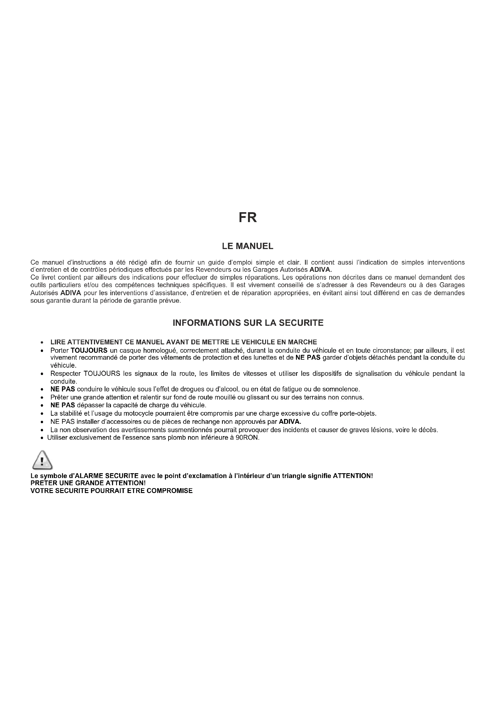 Ce manuel d'instructions a eted reigde afin de fournir un guide d'emploi simple et clair. Il contient au siic dines intenions d'entretien et de contrles periodiques effectues par les Revendeurs ou les Garages Autorises ADIVA.