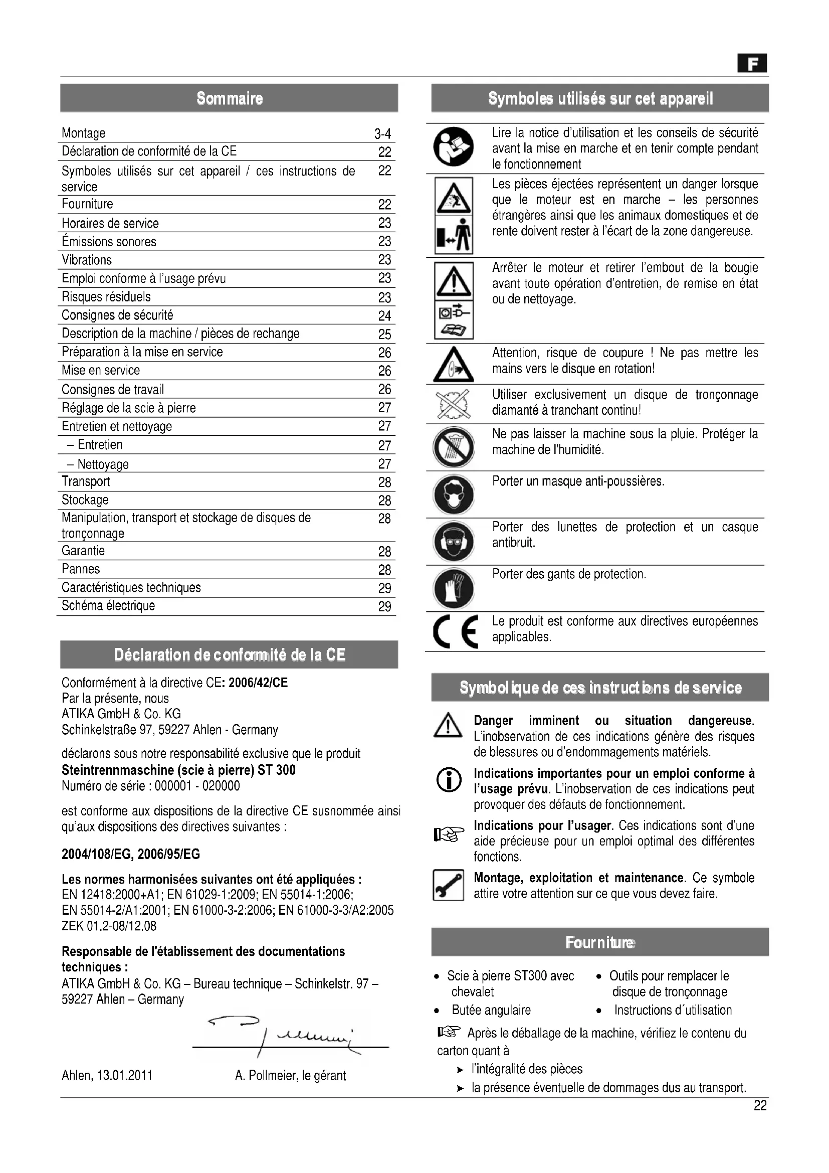 Conformément à la directive CE: 2006/42/CE Par la présente, nous ATIKA GmbH & Co. KG Schinkelstraße 97, 59227 Ahlen - Germany déclarons sous notre responsabilité exclusive que le produit Steintrennmaschine (scie à pierre) ST 300 Numéro de série : 000001 - 020000 est conforme aux dispositions de la directive CE susnommée ainsi qu’aux dispositions des directives suivantes : 2004/108/EG, 2006/95/EG Les normes harmonisées suivantes ont été appliquées : EN 12418:2000+A1; EN 61029-1:2009; EN 55014-1:2006; EN 55014-2/A1:2001; EN 61000-3-2:2006; EN 61000-3-3/A2:2005 ZEK 01.2-08/12.08 Responsable de l'établissement des documentations techniques : ATIKA GmbH & Co. KG – Bureau technique – Schinkelstr. 97 – 59227 Ahlen – Germany Ahlen, 13.01.2011 A. Pollmeier, le gérant