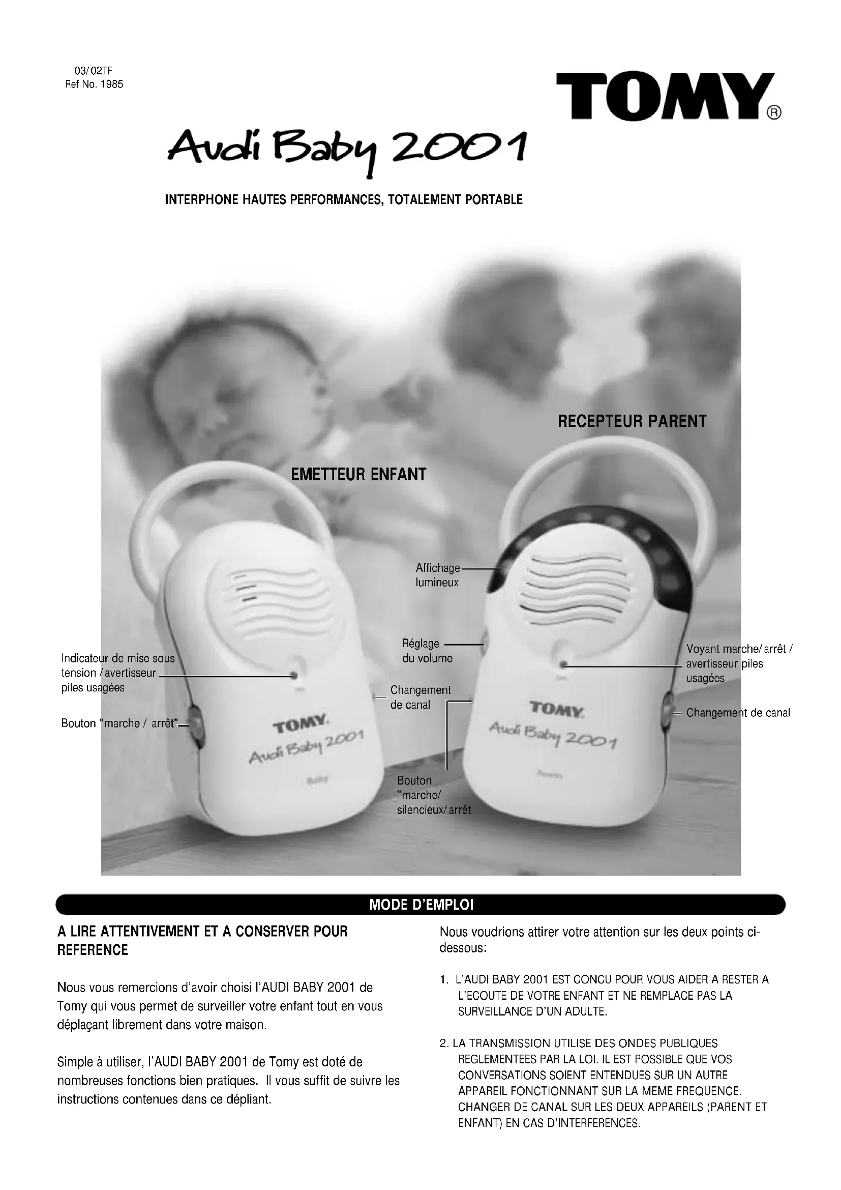 A LIRE ATTENTIVEMENT ET A CONSERVER POUR REFERENCE Nous vous remercions d’avoir choisi l’AUDI BABY 2001 de Tomy qui vous permet de surveiller votre enfant tout en vous déplaçant librement dans votre maison. Simple à utiliser, l’AUDI BABY 2001 de Tomy est doté de nombreuses fonctions bien pratiques. Il vous suffit de suivre les instructions contenues dans ce dépliant. Nous voudrions attirer votre attention sur les deux points ci- dessous: