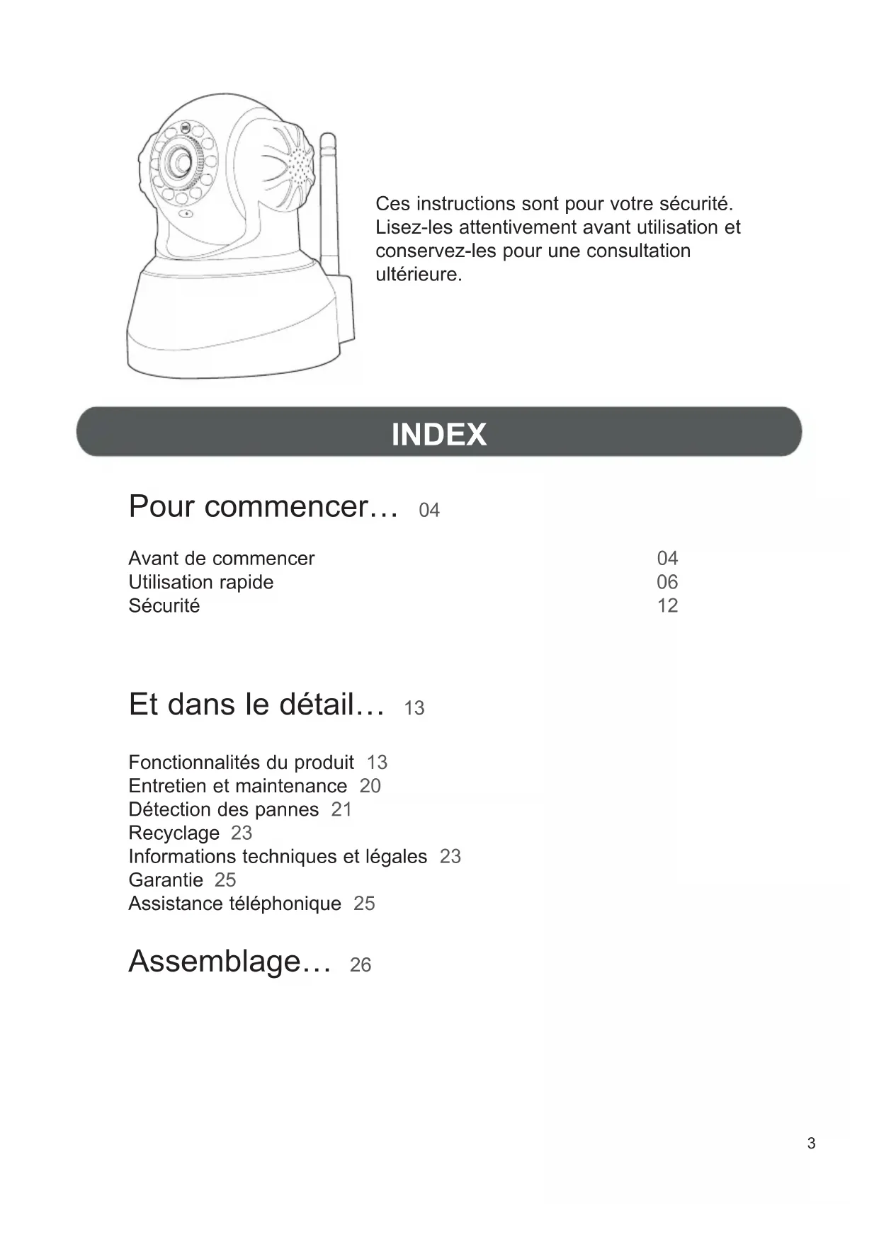 V22 [1] x1 [3] x1[2] x1 Quickstar t Username / Password Connect your camera entering your username and password [5] x1 [6] x1 [8] x1[7] x1 [4] x1 1 : 1 [9] x2 [10] x2 VOTRE PRODUIT3 Ces instructions sont pour votre sécurité. Lisez-les attentivement avant utilisation et conservez-les pour une consultation ultérieure. Pour commencer… 04 Avant de commencer 04 Utilisation rapide 06 Sécurité 12 Et dans le détail… 13 Fonctionnalités du produit 13 Entretien et maintenance 20 Détection des pannes 21 Recyclage 23 Informations techniques et légales 23 Garantie 25 Assistance téléphonique 25 Assemblage… 26 INDEX4
