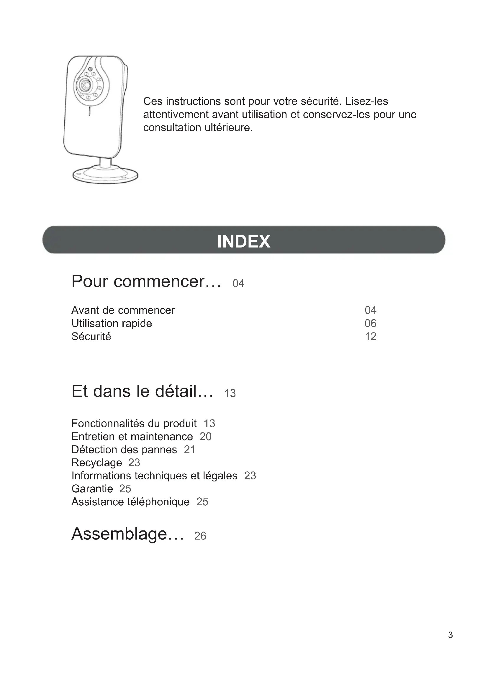 V22 [1] x1 [2] x1 [4] x1 Quickstart [5] x1 [3] x1 1 : 1 [8] x3 [9] x3 VOTRE PRODUIT Username / Password Connect your camera entering your username and password [7] x1[6] x13 Ces instructions sont pour votre sécurité. Lisez-les attentivement avant utilisation et conservez-les pour une consultation ultérieure. Pour commencer… 04 Avant de commencer 04 Utilisation rapide 06 Sécurité 12 Et dans le détail… 13 Fonctionnalités du produit 13 Entretien et maintenance 20 Détection des pannes 21 Recyclage 23 Informations techniques et légales 23 Garantie 25 Assistance téléphonique 25 Assemblage… 26 INDEX4 D’une connexion Internet haut débit (512 Kbits par seconde) accessible : - via un modem Internet haut débit avec utilisation d'un câble Ethernet (avec au moins 1 port Ethernet disponible).