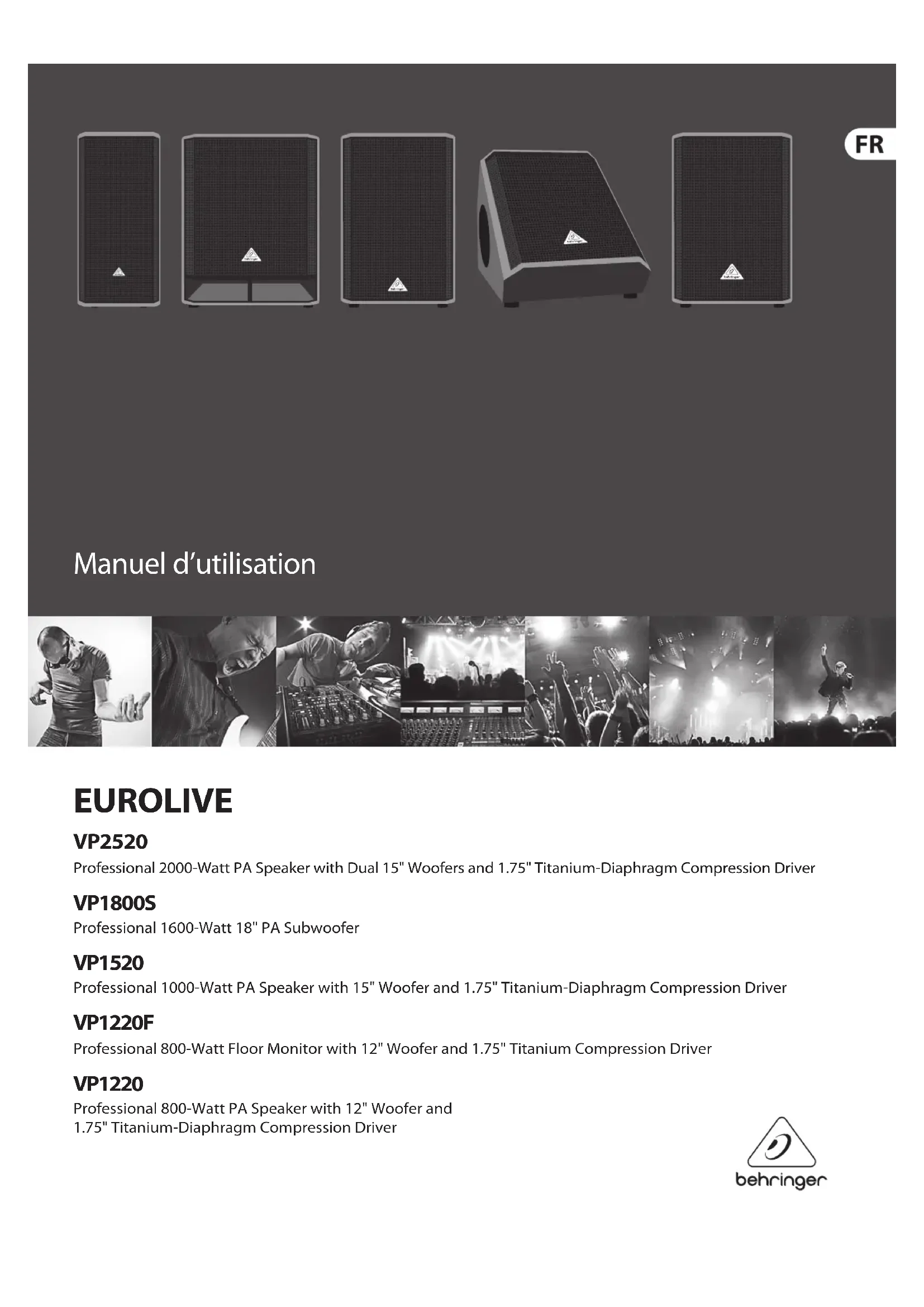 - Manuel d’utilisation EUROLIVE VP2520 Professional 2000-Watt PA Speaker with Dual 15" Woofers and 1.75" Titanium-Diaphragm Compression Driver VP1800S Professional 1600-Watt 18" PA Subwoofer VP1520 Professional 1000-Watt PA Speaker with 15" Woofer and 1.75" Titanium-Diaphragm Compression Driver VP1220F Professional 800-Watt Floor Monitor with 12" Woofer and 1.75" Titanium Compression Driver VP1220 Professional 800-Watt PA Speaker with 12" Woofer and 1.75" Titanium-Diaphragm Compression Driver2 EUROLIVE VP2520/VP1800S/VP1520/VP1220F/VP1220 Manuel d’utilisation Merci Merci d’avoir choisi nos enceintes de la gamme EUROLIVE VP. Ces enceintes de sonorisation sont puissantes, légères, compactes et orent un son exceptionnel. De plus, elles font partie d’un système de sonorisation évolutif, avec entrées et sorties en Jacks 6,35 mm mono et connecteurs à verrouillage professionnels. Elles sont équipées d’embases pour installation sur pied et de poignées encastrées. Les Woofers haute abilité délivrent des basses fréquences extrêmement puissantes et des médiums riches et articulés. Les Tweeters à compression restituent les hautes fréquences avec douceur et délité, garantissant une précision sonore maximale. Le Subwoofer VP1800S est parfaitement adapté pour fonctionner en complément des enceintes large- bande — le son est incroyablement puissant et massif ! Nous savons que ces enceintes de sonorisation polyvalentes et de haute qualité vous donneront entière satisfaction pendant de très longues années et vous garantiront que votre musique sera diusée et restituée exactement comme vous le souhaitez ! Table des matières Merci p. 2