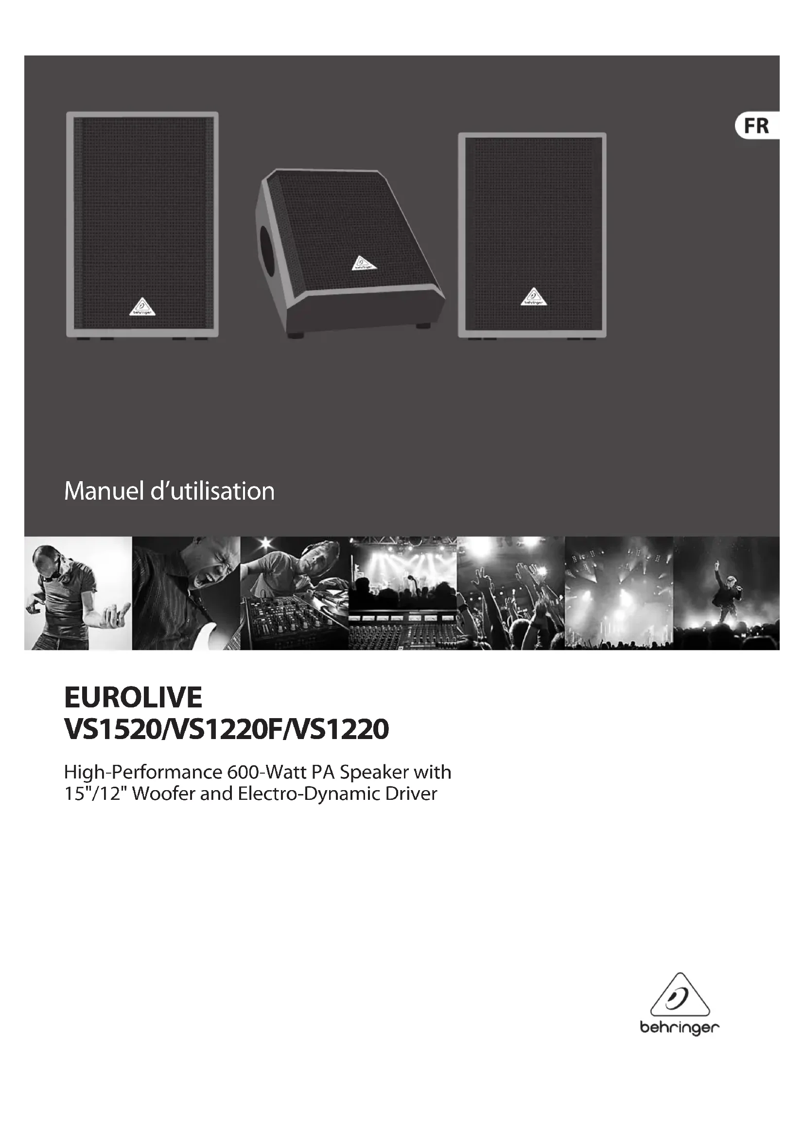 - Manuel d’utilisation EUROLIVE VS1520/VS1220F/VS1220 High-Performance 600-Watt PA Speaker with 15"/12" Woofer and Electro-Dynamic Driver2 EUROLIVE VS1520/VS1220F/VS1220 Manuel d’utilisation Merci Merci d’avoir choisi nos enceintes de la gamme EUROLIVE VS. Ces enceintes de sonorisation sont puissantes, légères, compactes et orent un son exceptionnel. De plus, elles font partie d’un système de sonorisation évolutif, avec entrées et sorties en Jacks 6,35 mm mono et connecteurs à verrouillage professionnels. Elles sont équipées d’embases pour installation sur pied et de poignées encastrées. Les Woofers haute abilité délivrent des basses fréquences extrêmement puissantes et des médiums riches et articulés. Les Tweeters à compression restituent les hautes fréquences avec douceur et délité, garantissant une précision sonore maximale. Nous savons que ces enceintes de sonorisation polyvalentes et de haute qualité vous donneront entière satisfaction pendant de très longues années et vous garantiront que votre musique sera diusée et restituée exactement comme vous le souhaitez ! Table des matières Merci p. 2