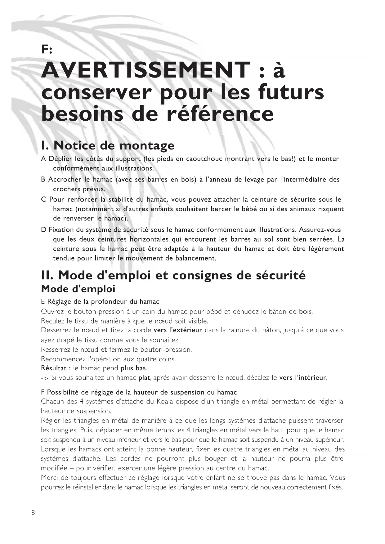 Si vous souhaitez un hamac plat, après avoir desserré le nœud, décalez-le vers l’intérieur. F Possibilité de réglage de la hauteur de suspension du hamac Chacun des 4 systèmes d’attache du Koala dispose d’un triangle en métal permettant de régler la hauteur de suspension. Régler les triangles en métal de manière à ce que les longs systèmes d’attache puissent traverser les triangles. Puis, déplacer en même temps les 4 triangles en métal vers le haut pour que le hamac soit suspendu à un niveau inférieur et vers le bas pour que le hamac soit suspendu à un niveau supérieur. Lorsque les hamacs ont atteint la bonne hauteur, fixer les quatre triangles en métal au niveau des systèmes d’attache. Les cordes ne pourront plus bouger et la hauteur ne pourra plus être modifiée – pour vérifier, exercer une légère pression au centre du hamac. Merci de toujours effectuer ce réglage lorsque votre enfant ne se trouve pas dans le hamac. Vous pourrez le réinstaller dans le hamac lorsque les triangles en métal seront de nouveau correctement fixés. 120626_Koala_Anleitung_des3_DIN A5 26.06.12 10:02 Seite 8Préféré par les bébés Après sa naissance, un bébé se sent privé du mécanisme protecteur et du sentiment de sécurité assurés par le ventre de sa mère. Dans notre hamac, il peut retrouver ce sentiment de sécurité et se sentir comme s’il était encore dans le ventre de sa mère. La position embryonnaire (nous recommandons la couverture doublée Sunny qui tient chaud) et l’expérience du bercement calmant apaisent votre bébé en un clin d’œil. Pour profiter de cet effet positif de manière optimale, n'utilisez pas de matelas rigides / durs dans le hamac. Hamac avec vue? Si vous voulez laisser le bébé regarder sur les bords du hamac, vous pouvez ajuster facilement les cordelettes du hamac de manière que la tête du bébé soit positionnée plus haute que ses jambes. Raccourcir les cordelettes prévues du côté où la tête du bébé est couchée. (Si ceci n’est pas possible, rallonger les cordelettes prévues de l’autre côté.) Installation Grâce aux vis moletées et à leurs boulons autobloquants autorisées par l’organisme de contrôle allemand « TÜV », le montage du hamac ne nécessitant pas d’outils et pas d’effort est véritablement un jeu d’enfant ! Un avantage supérieur est que les vis sont équipées d’un verrouillage de sécurité excluant ainsi le risque potentiel que les bébés les avalent ! 100% coton
