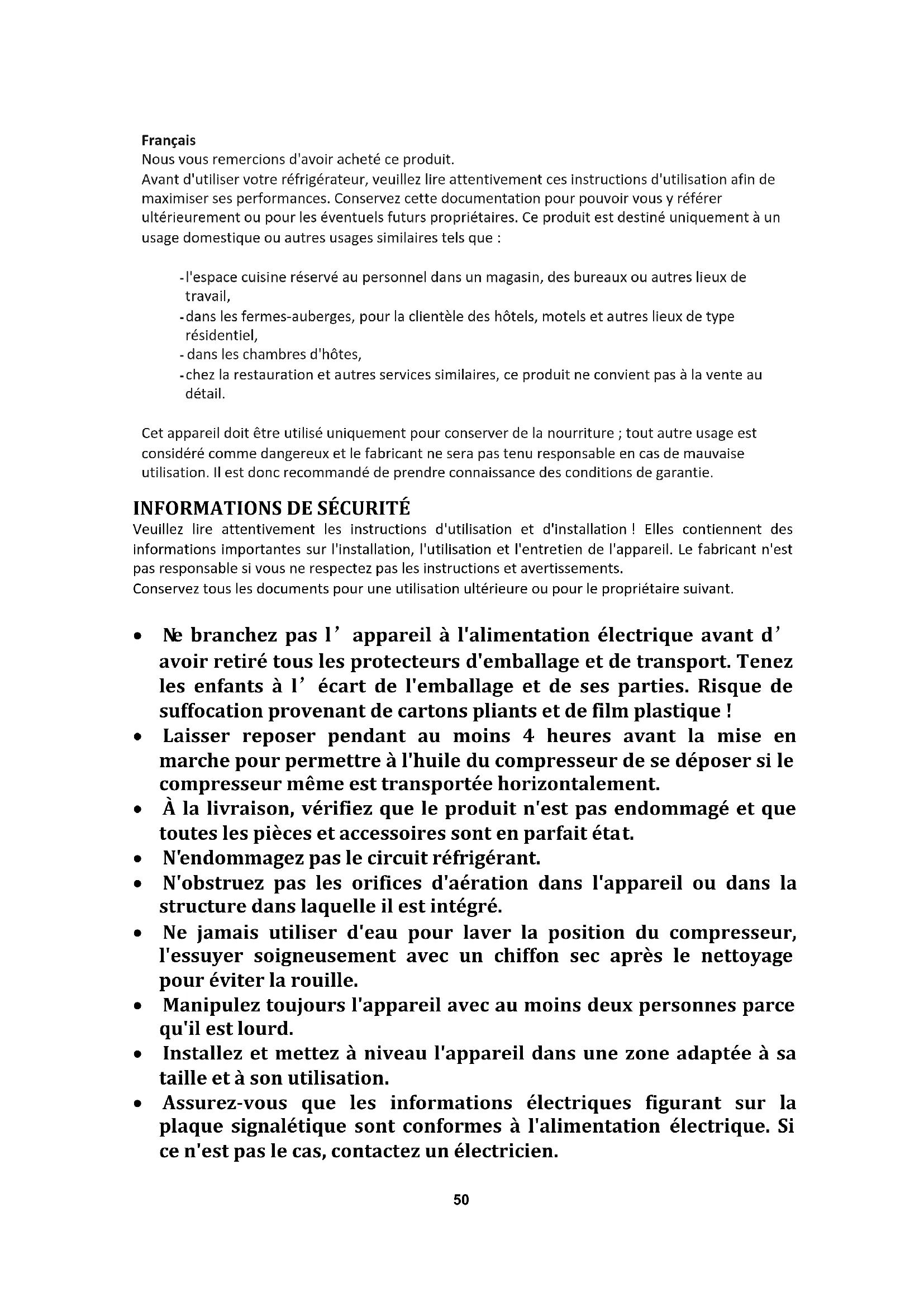 et appareil doit être utilisé uniquement pour conserver de la nourriture ; tout autre usage est considéré comme dangereux et le fabricant ne sera pas tenu responsable en cas de mauvaise utilisation. Il est donc recommandé de prendre connaissance des conditions de garantie.