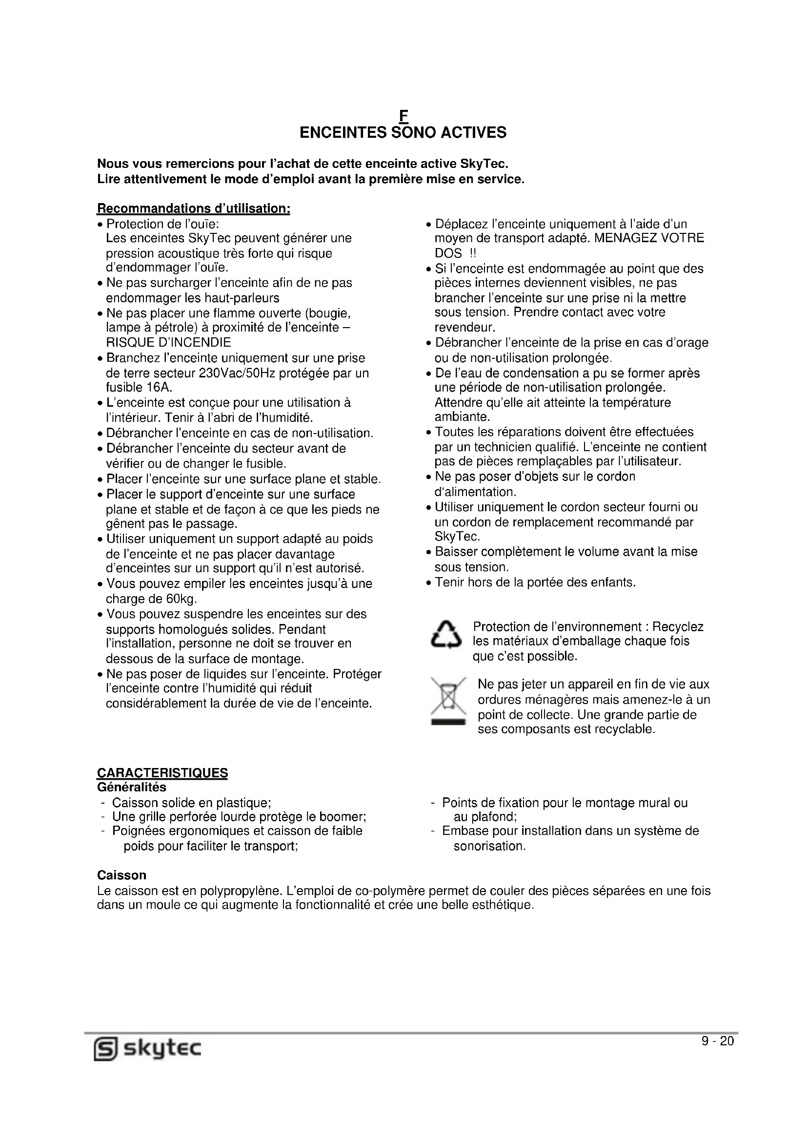 - Protection de l'ouïe: Les enceintes SkyTec peuvent générer une pression acoustique très forte qui risque d'endommager l'ouïe.