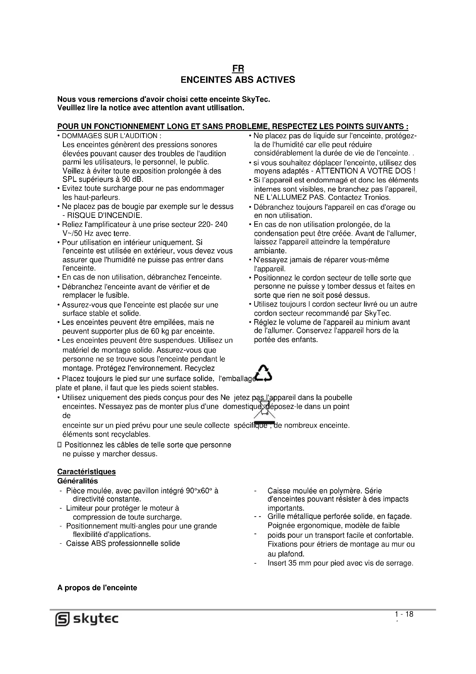 Nous vous remercions d'avoir choisi cette enceinte SkyTec. Veuillez lire la notice avec attention avant utilisation.