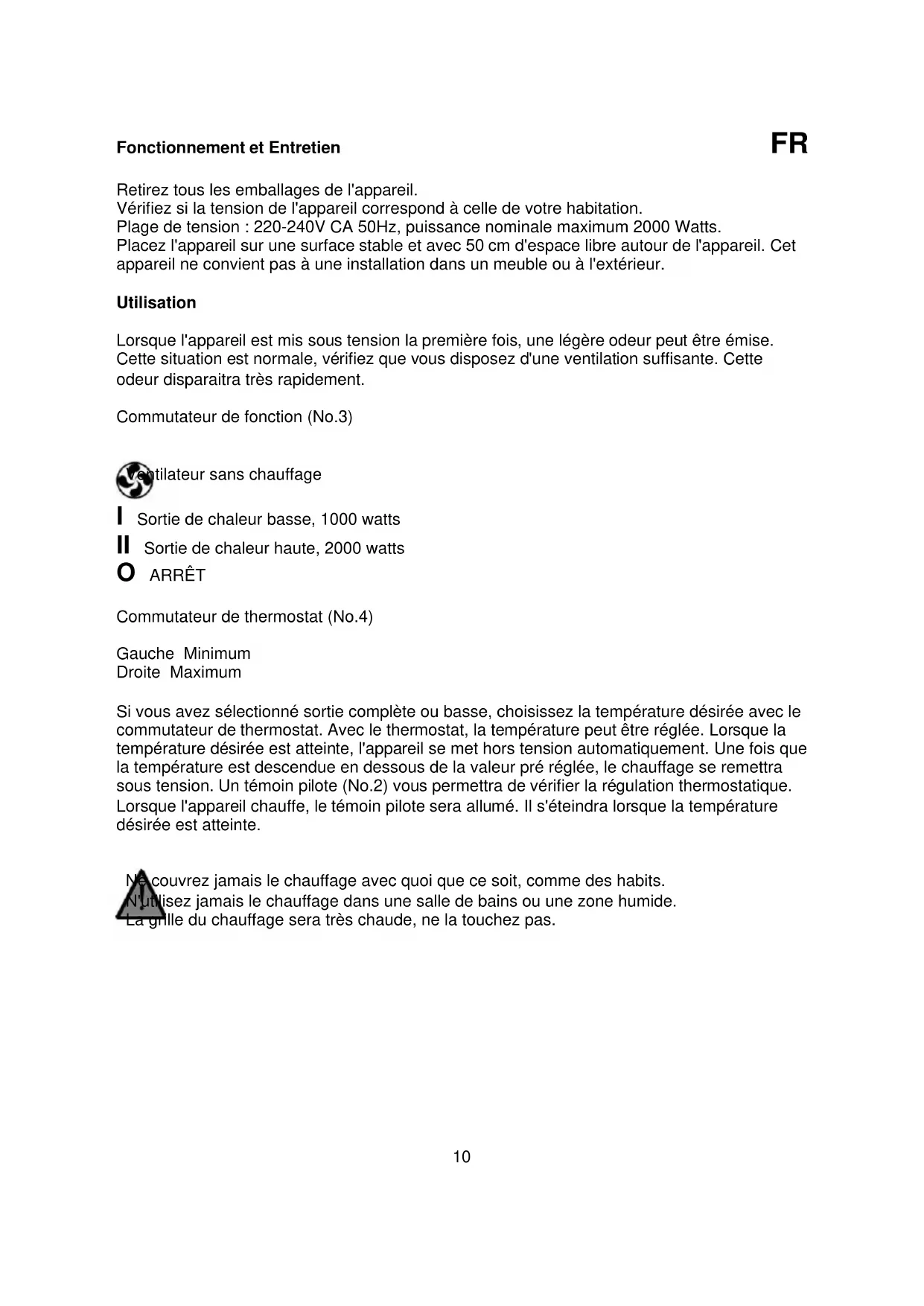 Packaging The packaging is 100% recyclable, return the packaging separated. Product This device is equipped with a mark according to European Directive 2002/96/EC. On Waste Electrical and Electronic Equipment (WEEE). By ensuring that the product correctly as waste is processed, it helps you may have adverse consequences for the environment and human health. EC declaration of conformity This device is designed, manufactured and marketed in accordance with the safety objectives of the Low Voltage Directive "No 73/23/EEC, the protection requirements of the EMC Directive 89/336/EC "Electromagnetic Compatibility" and the requirement of Directive 93/68/EEC.10 Fonctionnement et Entretien FR Retirez tous les emballages de l'appareil. Vérifiez si la tension de l'appareil correspond à celle de votre habitation. Plage de tension : 220-240V CA 50Hz, puissance nominale maximum 2000 Watts. Placez l'appareil sur une surface stable et avec 50 cm d'espace libre autour de l'appareil. Cet appareil ne convient pas à une installation dans un meuble ou à l'extérieur. Utilisation Lorsque l'appareil est mis sous tension la première fois, une légère odeur peut être émise. Cette situation est normale, vérifiez que vous disposez d'une ventilation suffisante. Cette odeur disparaitra très rapidement. Commutateur de fonction (No.3)