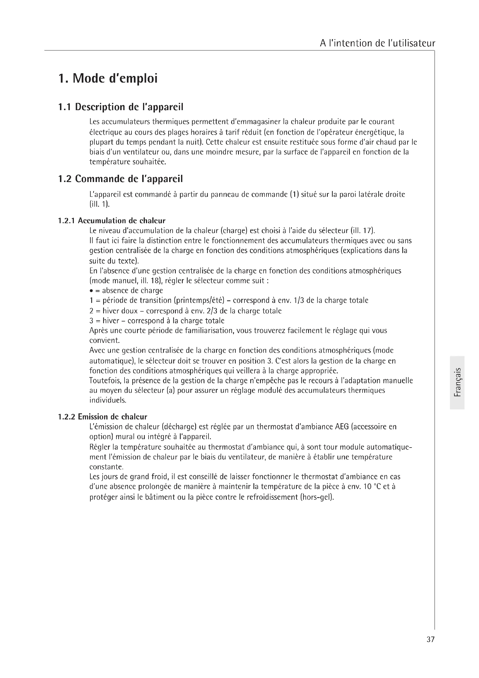 L'émission de chaleur (décharge) est réglée par un thermostat d'ambiance AEG (accessoire en option) mural ou intégré à l'apparil.
