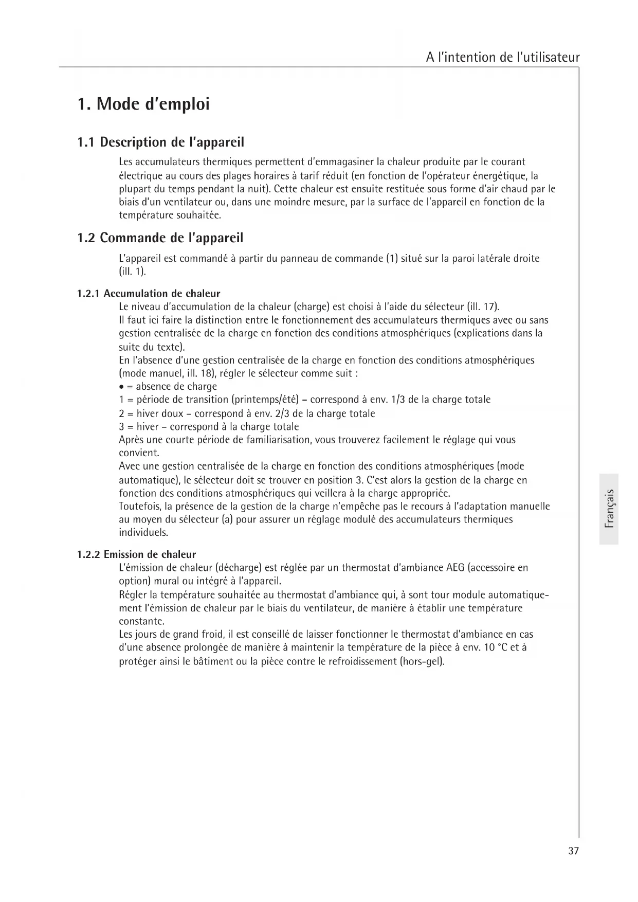 L’émission de chaleur (décharge) est réglée par un thermostat d’ambiance AEG (accessoire en option) mural ou intégré à l’appareil. Régler la température souhaitée au thermostat d’ambiance qui, à sont tour module automatique- ment l’émission de chaleur par le biais du ventilateur, de manière à établir une température constante. Les jours de grand froid, il est conseillé de laisser fonctionner le thermostat d’ambiance en cas d’une absence prolongée de manière à maintenir la température de la pièce à env. 10 °C et à protéger ainsi le bâtiment ou la pièce contre le refroidissement (hors-gel). A l’intention de l’utilisateur38