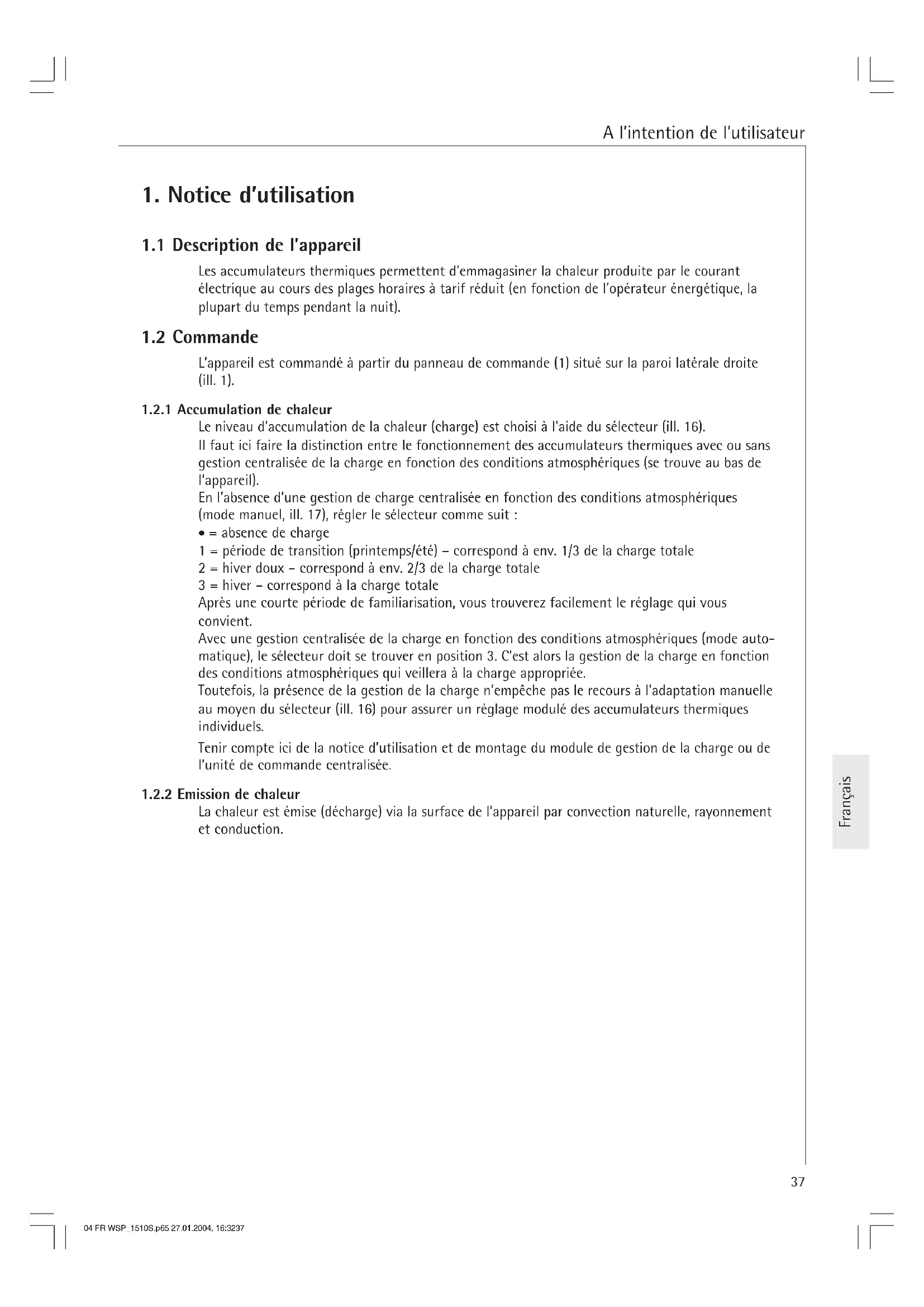 Dysfonctionnement Le régulateur de charge de l’appareil est réglé à l’usine sur « dysfonctionnement positif (80 % PS), c’est-à-dire qu’en cas de panne de la programmation de la charge (ex. absence de signal de commande), l’appareil est tout de même chargé en totalité. On peut passer en « dysfonctionnement négatif » (pas de charge de l’accumulateur de chaleur) en déplaçant le cavalier X16 sur la Position « 80 % NS » si l’appareil est branché sur un module numérique de gestion de la charge. Fonctionnement avec gestion de la charge Tenir compte des remarques correspondantes dans la notice d’utilisation et de montage de la gestion de la charge. Signal de commande Le régulateur de charge électronique peut être relié au module de gestion par différents signaux de commande (ED), ce qui permet de l’intégrer à des installations existantes. Il est réglé à l’usine sur un signal de commande CA (signal de courant alternatif aux bornes A1/ A2 ) avec 80 % ED. D’autres signaux ED (68/72, 37/4 0%) peuvent être sélectionnés par déplacement du cavalier X16. C’est nécessaire lorsque l’appareil est intégré dans une installation existante qui gère la charge au moyen de l’un des signaux ED évoqués. A l’intention de l’installateur 04 FR WSP_1510S.p65 27.01.2004, 16:324243 Français A l’intention de l’installateur Raccordement au signal de commande CC (X3) (voir schéma électrique page 18) Si l’installation est équipée d’une gestion de la charge à signal de commande CC (courant continu 0,91 V – 1,43 V), le signal de commande doit être branché sur les bornes de commande « CC + » (pôle positif) et « CC –» (pôle négatif) (tenir compte de la polarité !) recouvertes à l’usine. Le signal de commande 230 V CA ne doit pas être branché aux bornes « CC + » et « CC –». Cela risquerait d’endommager le régulateur de charge. Témoin de fonctionnement/dysfonctionnement (V4) du régulateur de charge électronique LED « vert » ⇒ pas de dysfontionnement le régulateur de charge fonctionne correctement. LED « rouge» ⇒ dysfontionnement a) Le sélecteur de charge (R1) et/ou le capteur interne (B1) est défectueux ou non branché. b) Le cavalier X17 servant à abaisser le niveau de charge manque. La charge n’a pas lieu.