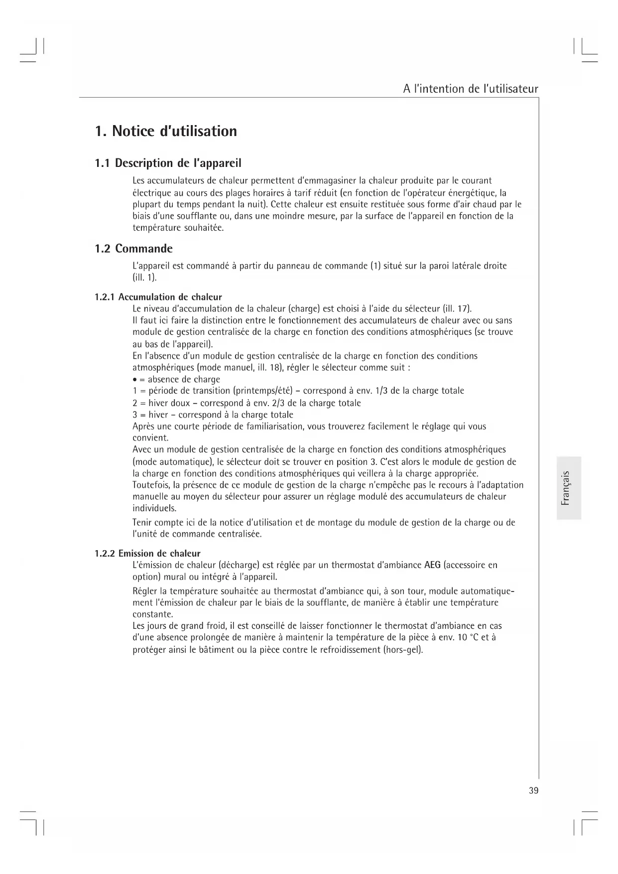 L’émission de chaleur (décharge) est réglée par un thermostat d’ambiance AEG (accessoire en option) mural ou intégré à l’appareil. Régler la température souhaitée au thermostat d’ambiance qui, à son tour, module automatique- ment l’émission de chaleur par le biais de la soufflante, de manière à établir une température constante. Les jours de grand froid, il est conseillé de laisser fonctionner le thermostat d’ambiance en cas d’une absence prolongée de manière à maintenir la température de la pièce à env. 10 °C et à protéger ainsi le bâtiment ou la pièce contre le refroidissement (hors-gel). A l’intention de l’utilisateur40