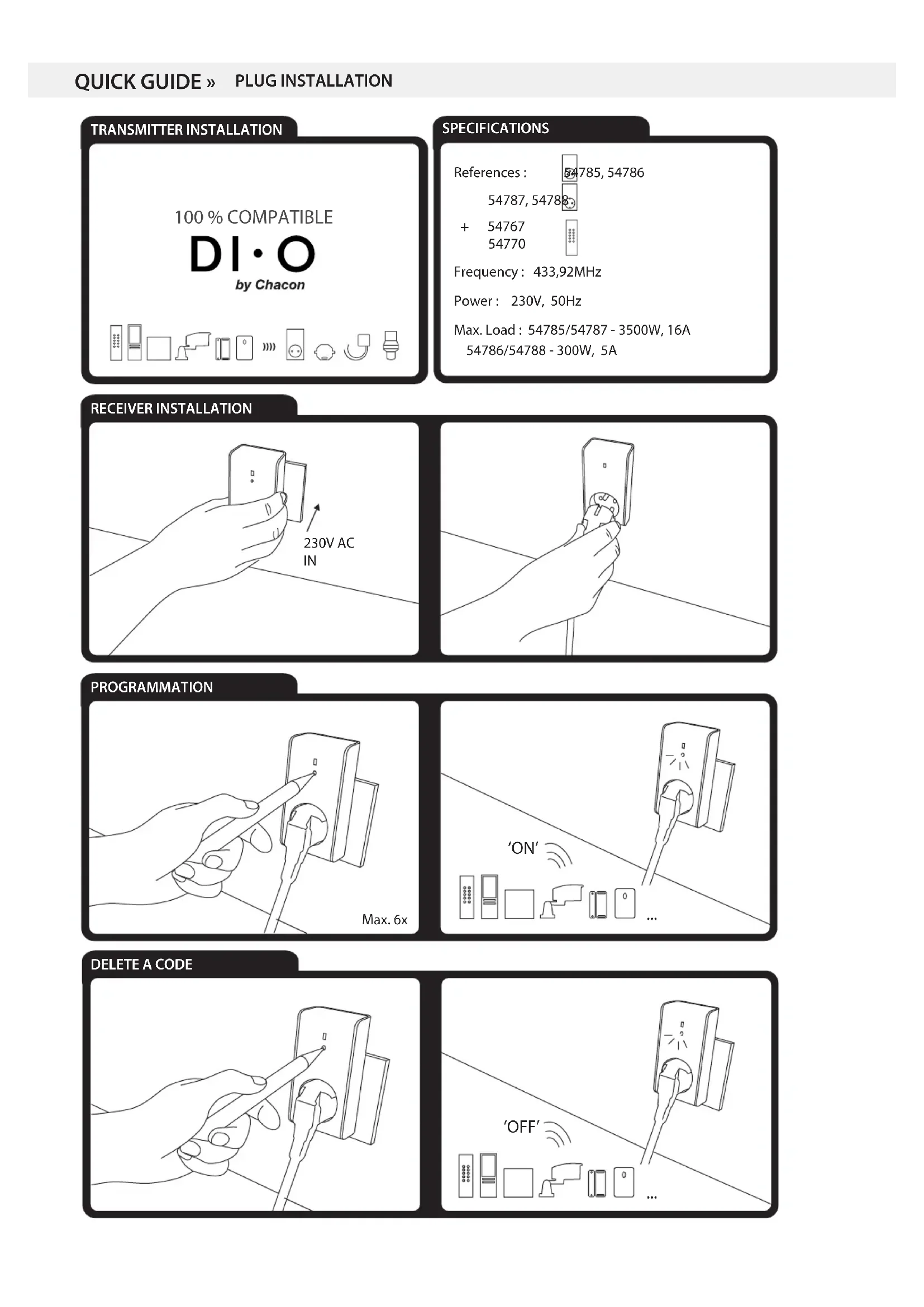 ‘OFF’FR – Prise & Télécommande (54761, 54765, 54766, 54767, 54785, 54786) Installer la prise (récepteur) : 1° Insérer la prise-récepteur dans le courant. 2° L’indicateur led s’allume. 3° Insérer la prise de la lampe dans la prise-récepteur. 4° Relier la prise à l’émetteur (voir Apprentissage du code). Installer l’émetteur: Voir schémas - On/O : Appuyer sur le bouton‘ON’(‘OFF’) de l’émetteur pour allumer (éteindre) l’appareil. - Variateur : Appuyer deux fois sur le bouton ‘ON’ de l’interrupteur, la lampe commence à dimmer, appuyer une nouvelle fois, la lampe s’éteint à la luminosité requise. Pour dimmer une nouvelle fois, recommencer la procédure.