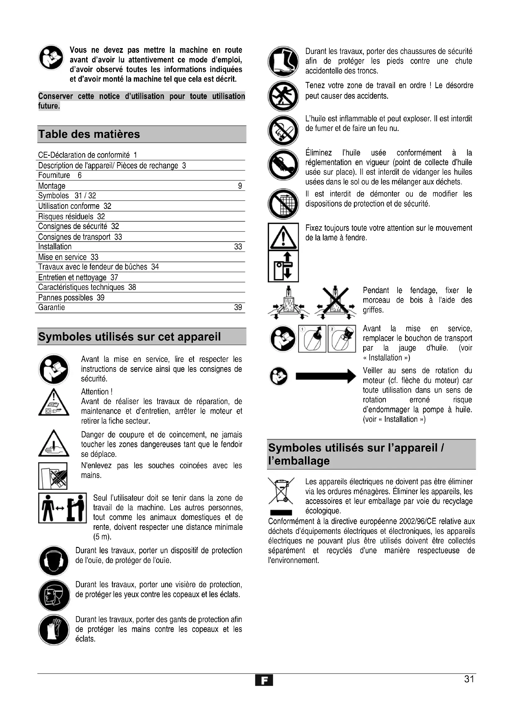 Table des matières CE-Déclaration de conformité 1 Description de l'appareil/ Pièces de rechange 3 Fourniture 6 Montage 9 Symboles 31 / 32 Utilisation conforme 32 Risques résiduels 32 Consignes de sécurité 32 Consignes de transport 33 Installation 33 Mise en service 33 Travaux avec le fendeur de bûches 34 Entretien et nettoyage 37 Caractéristiques techniques 38 Pannes possibles 39 Garantie 39