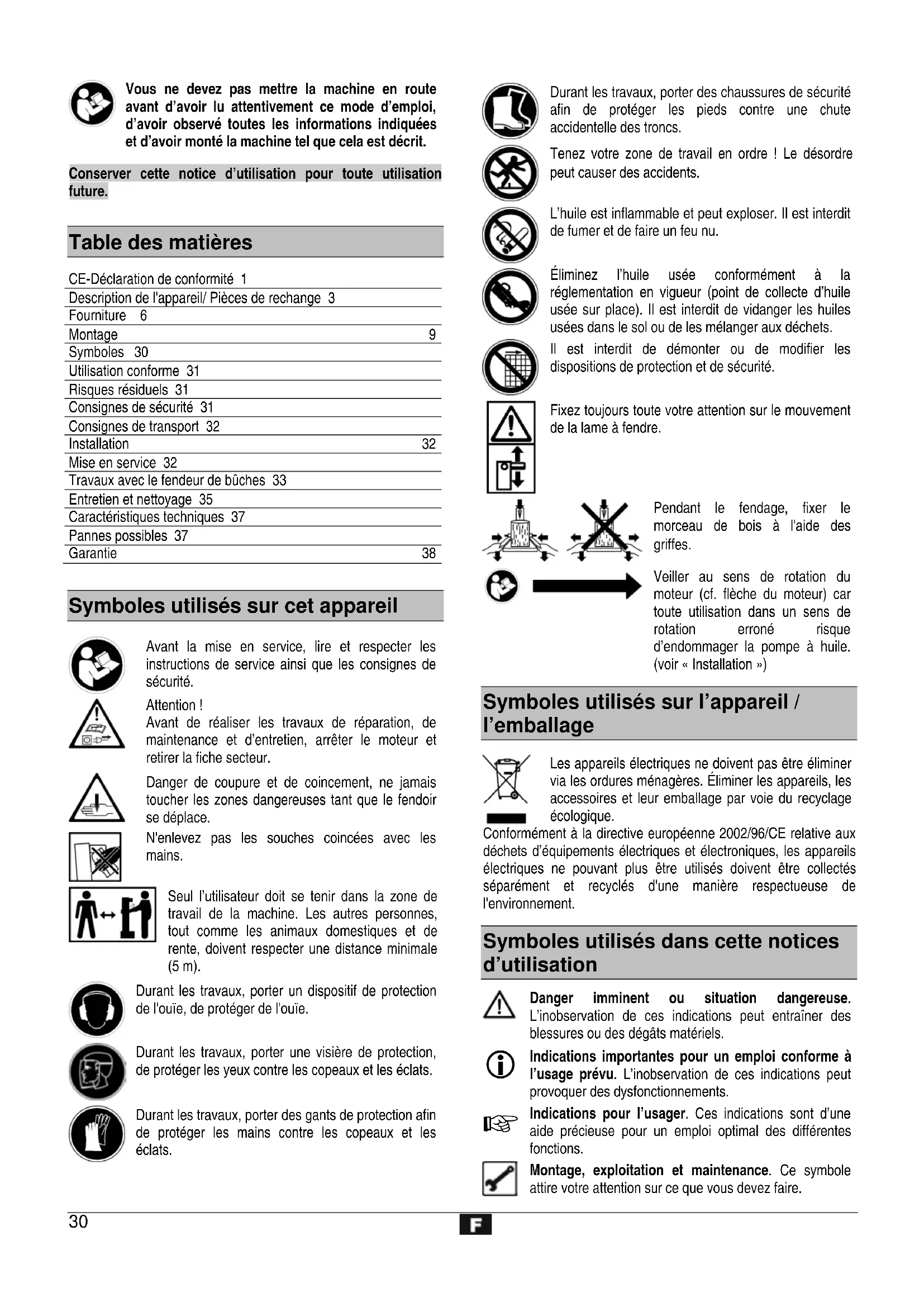 Indications pour l’usager. Ces indications sont d’une aide précieuse pour un emploi optimal des différentes fonctions. Montage, exploitation et maintenance. Ce symbole attire votre attention sur ce que vous devez faire.31 Utilisation conforme Le fendeur de bûches convient uniquement pour fendre le bois. Seul le bois découpé convient pour le fendeur de bûches. Éliminer impérativement les corps étrangers (clous, fils de fer, béton etc.) du bois à fendre. Un emploi conforme à l’usage prévu implique notamment aussi l’observation des instructions de service, de maintenance et de réparation du fabricant et le respect des consignes de sécurité contenues dans ces instructions. Toute utilisation divergente de la machine est considérée comme emploi non conforme à l’usage prévu. Le fabricant décline toute responsabilité pour les dommages en résultant : le risque incombe exclusivement à l’usager. La machine ne doit être utilisé, entretenu et ajusté que par des personnes connaissant l'appareil et averties des risques qui y sont liés. Les réparations demeurent strictement réservées à notre SAV ou à un service après-vente nommé par nos soins.
