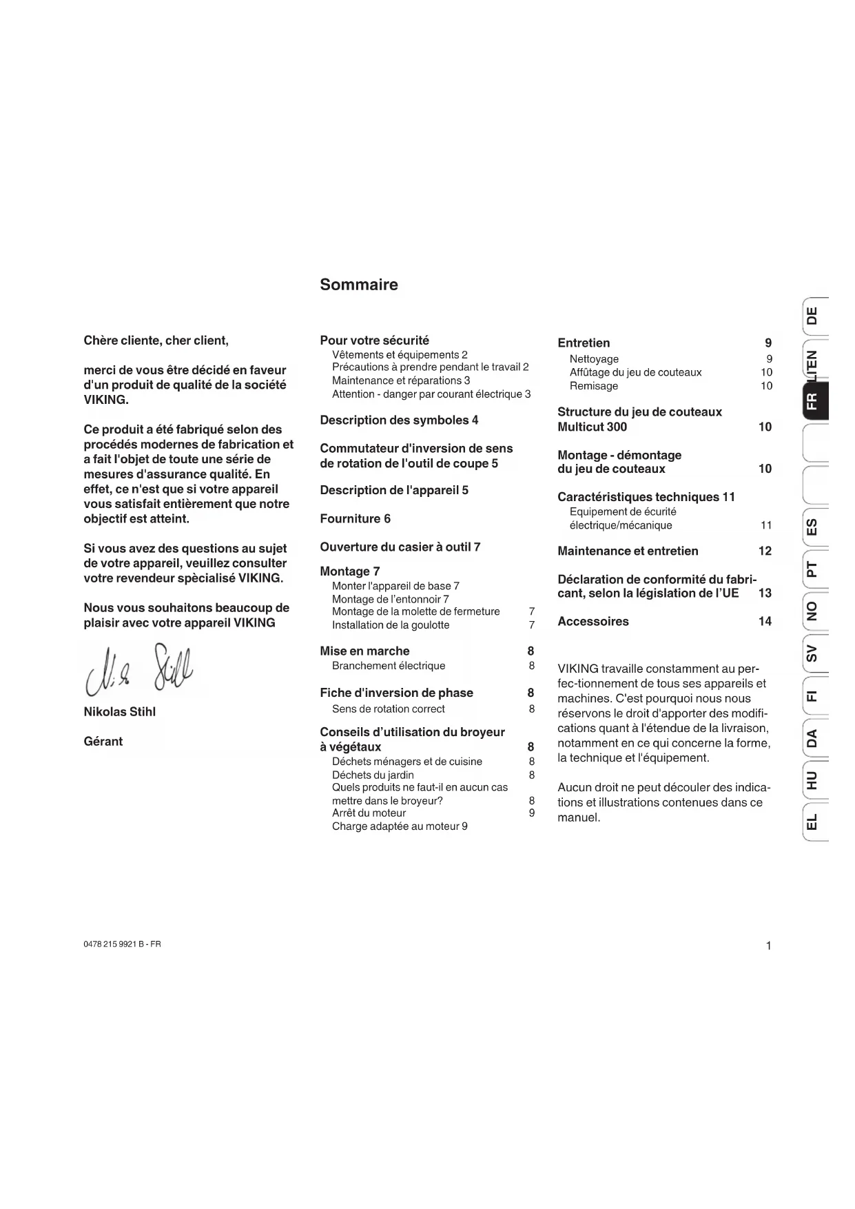 Chère cliente, cher client, merci de vous être décidé en faveur d'un produit de qualité de la société VIKING. Ce produit a été fabriqué selon des procédés modernes de fabrication et a fait l'objet de toute une série de mesures d'assurance qualité. En effet, ce n'est que si votre appareil vous satisfait entièrement que notre objectif est atteint. Si vous avez des questions au sujet de votre appareil, veuillez consulter votre revendeur spècialisé VIKING. Nous vous souhaitons beaucoup de plaisir avec votre appareil VIKING Nikolas Stihl Gérant Sommaire VIKING travaille constamment au per- fec-tionnement de tous ses appareils et machines. C'est pourquoi nous nous réservons le droit d'apporter des modifi- cations quant à l'étendue de la livraison, notamment en ce qui concerne la forme, la technique et l'équipement. Aucun droit ne peut découler des indica- tions et illustrations contenues dans ce manuel. Pour votre sécurité Vêtements et équipements 2 Précautions à prendre pendant le travail 2 Maintenance et réparations 3 Attention - danger par courant électrique 3 Description des symboles 4 Commutateur d'inversion de sens de rotation de l'outil de coupe 5 Description de l'appareil 5 Fourniture 6 Ouverture du casier à outil 7 Montage 7 Monter l'appareil de base 7 Montage de l’entonnoir 7 Montage de la molette de fermeture 7 Installation de la goulotte 7 Mise en marche 8 Branchement électrique 8 Fiche d'inversion de phase 8 Sens de rotation correct 8 Conseils d’utilisation du broyeur à végétaux 8 Déchets ménagers et de cuisine 8 Déchets du jardin 8 Quels produits ne faut-il en aucun cas mettre dans le broyeur? 8 Arrêt du moteur 9 Charge adaptée au moteur 9 Entretien 9 Nettoyage 9 Affûtage du jeu de couteaux 10 Remisage 10 Structure du jeu de couteaux Multicut 300 10 Montage - démontage du jeu de couteaux 10 Caractéristiques techniques 11 Equipement de écurité électrique/mécanique 11 Maintenance et entretien 12 Déclaration de conformité du fabri- cant, selon la législation de l’UE 13 Accessoires 140478 215 9921 B - FR