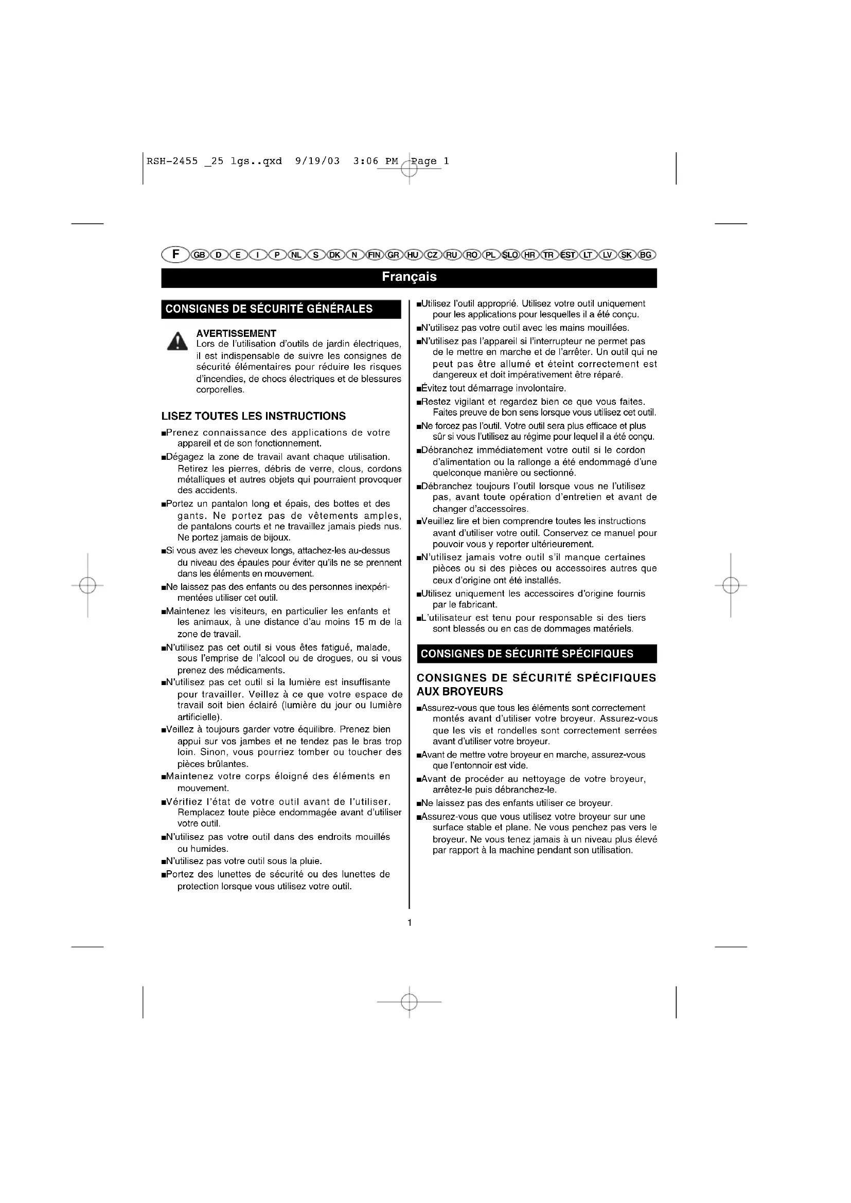 Lors de l'utilisation d'outils de jardin électriques, il est indispensable de suivre les consignes de sécurité élémentaires pour réduire les risques d'incendies, de chocs électriques et de blessures corporelles.