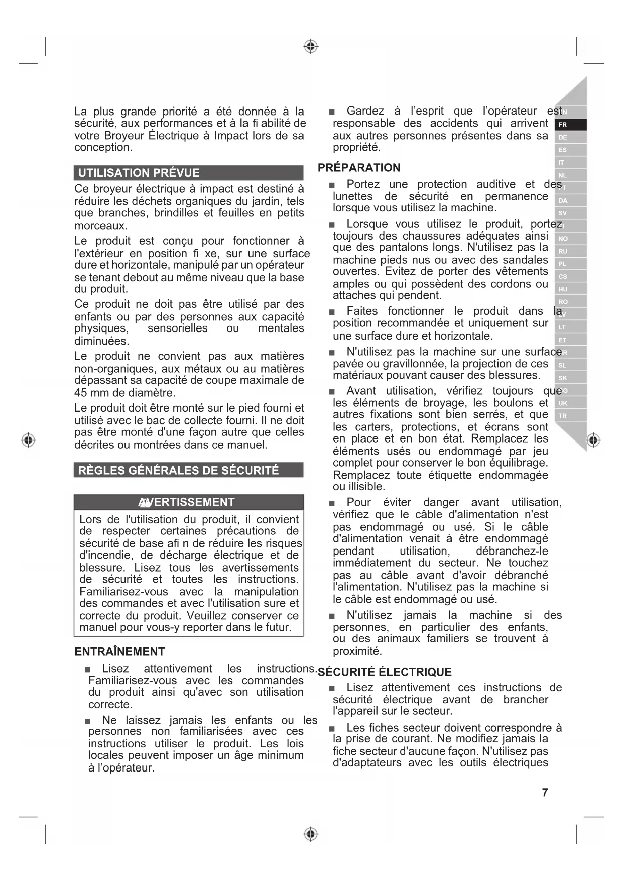 Ce broyeur électrique à impact est destiné à réduire les déchets organiques du jardin, tels que branches, brindilles et feuilles en petits morceaux. Le produit est conçu pour fonctionner à l'extérieur en position fi xe, sur une surface dure et horizontale, manipulé par un opérateur se tenant debout au même niveau que la base du produit. Ce produit ne doit pas être utilisé par des enfants ou par des personnes aux capacité physiques, sensorielles ou mentales diminuées. Le produit ne convient pas aux matières non-organiques, aux métaux ou au matières dépassant sa capacité de coupe maximale de 45 mm de diamètre. Le produit doit être monté sur le pied fourni et utilisé avec le bac de collecte fourni. Il ne doit pas être monté d'une façon autre que celles décrites ou montrées dans ce manuel. RÈGLES GÉNÉRALES DE SÉCURITÉ AVERTISSEMENT Lors de l'utilisation du produit, il convient de respecter certaines précautions de sécurité de base afi n de réduire les risques d'incendie, de décharge électrique et de blessure. Lisez tous les avertissements de sécurité et toutes les instructions. Familiarisez-vous avec la manipulation des commandes et avec l'utilisation sure et correcte du produit. Veuillez conserver ce manuel pour vous-y reporter dans le futur. ENTRAÎNEMENT ■ Lisez attentivement les instructions. Familiarisez-vous avec les commandes du produit ainsi qu'avec son utilisation correcte. ■ Ne laissez jamais les enfants ou les personnes non familiarisées avec ces instructions utiliser le produit. Les lois locales peuvent imposer un âge minimum à l’opérateur. ■ Gardez à l’esprit que l’opérateur est responsable des accidents qui arrivent aux autres personnes présentes dans sa propriété. PRÉPARATION ■ Portez une protection auditive et des lunettes de sécurité en permanence lorsque vous utilisez la machine. ■ Lorsque vous utilisez le produit, portez toujours des chaussures adéquates ainsi que des pantalons longs. N'utilisez pas la machine pieds nus ou avec des sandales ouvertes. Evitez de porter des vêtements amples ou qui possèdent des cordons ou attaches qui pendent. ■ Faites fonctionner le produit dans la position recommandée et uniquement sur une surface dure et horizontale. ■ N'utilisez pas la machine sur une surface pavée ou gravillonnée, la projection de ces matériaux pouvant causer des blessures. ■ Avant utilisation, vérifiez toujours que les éléments de broyage, les boulons et autres fixations sont bien serrés, et que les carters, protections, et écrans sont en place et en bon état. Remplacez les éléments usés ou endommagé par jeu complet pour conserver le bon équilibrage. Remplacez toute étiquette endommagée ou illisible. ■ Pour éviter danger avant utilisation, vérifiez que le câble d'alimentation n'est pas endommagé ou usé. Si le câble d'alimentation venait à être endommagé pendant utilisation, débranchez-le immédiatement du secteur. Ne touchez pas au câble avant d'avoir débranché l'alimentation. N'utilisez pas la machine si le câble est endommagé ou usé. ■ N'utilisez jamais la machine si des personnes, en particulier des enfants, ou des animaux familiers se trouvent à proximité.