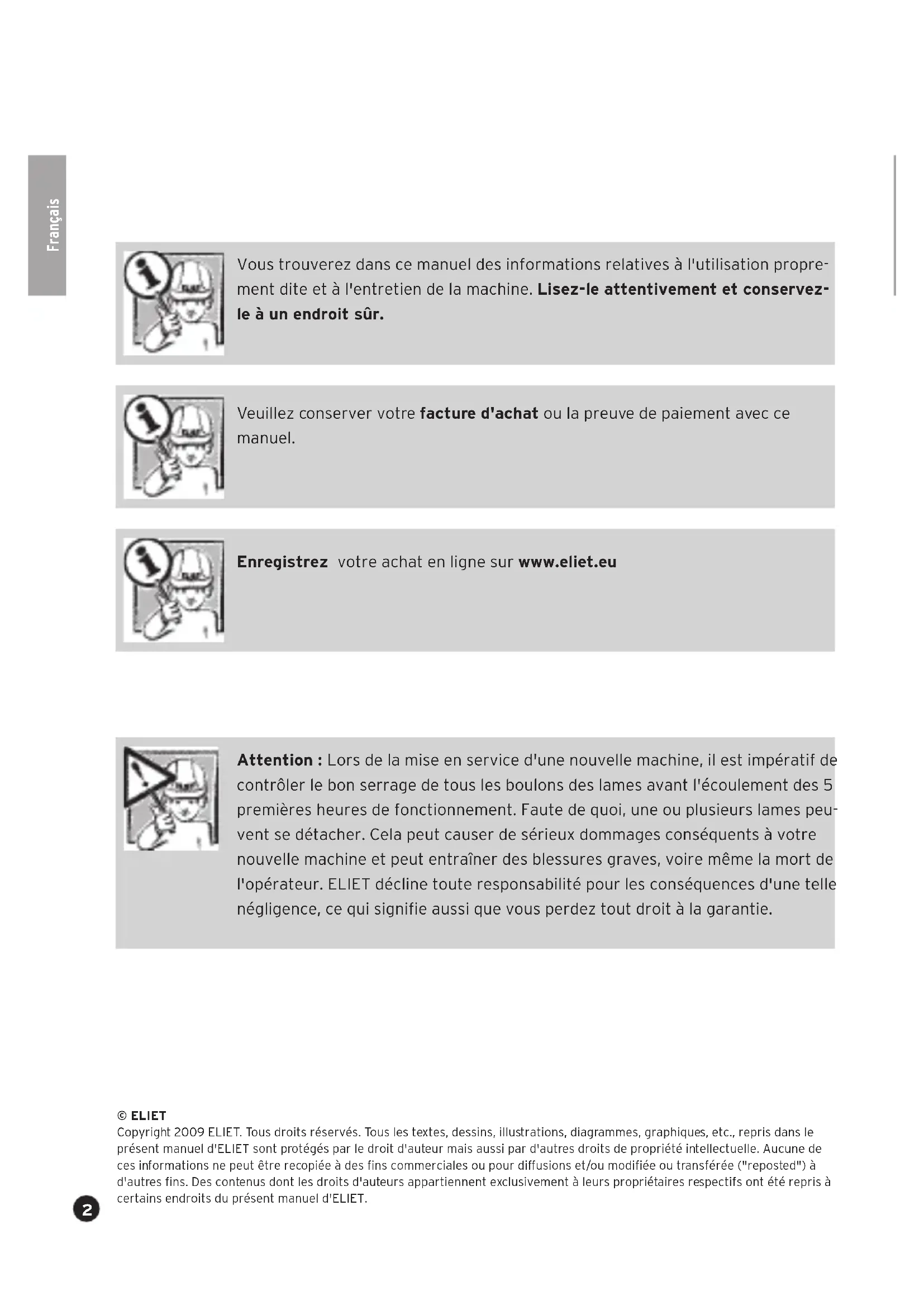 Les machines ELIET sont conçues pour fonctionner de façon sure et fiable à condition d'être utilisées conformément aux instructions. Vous devez lire attentivement leprésent mode d'emploi avant d'utiliser la machine. Faute de quoi, il peut y avoir un risque de blessures corporelles ou de dégats matériels.