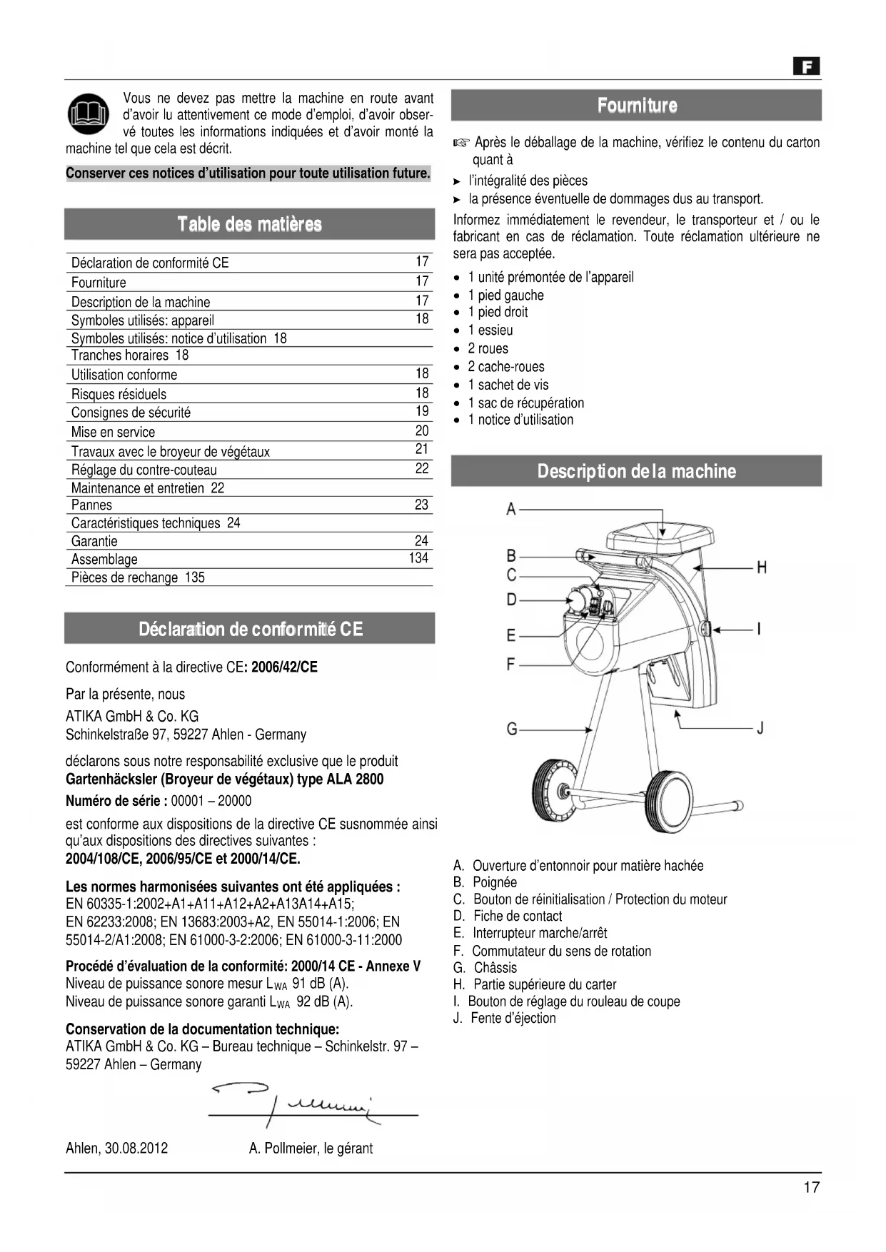 Conformément à la directive CE: 2006/42/CE Par la présente, nous ATIKA GmbH & Co. KG Schinkelstraße 97, 59227 Ahlen - Germany déclarons sous notre responsabilité exclusive que le produit Gartenhäcksler (Broyeur de végétaux) type ALA 2800 Numéro de série : 00001 – 20000 est conforme aux dispositions de la directive CE susnommée ainsi qu’aux dispositions des directives suivantes : 2004/108/CE, 2006/95/CE et 2000/14/CE. Les normes harmonisées suivantes ont été appliquées : EN 60335-1:2002+A1+A11+A12+A2+A13A14+A15; EN 62233:2008; EN 13683:2003+A2, EN 55014-1:2006; EN 55014-2/A1:2008; EN 61000-3-2:2006; EN 61000-3-11:2000 Procédé d’évaluation de la conformité: 2000/14 CE - Annexe V Niveau de puissance sonore mesur L