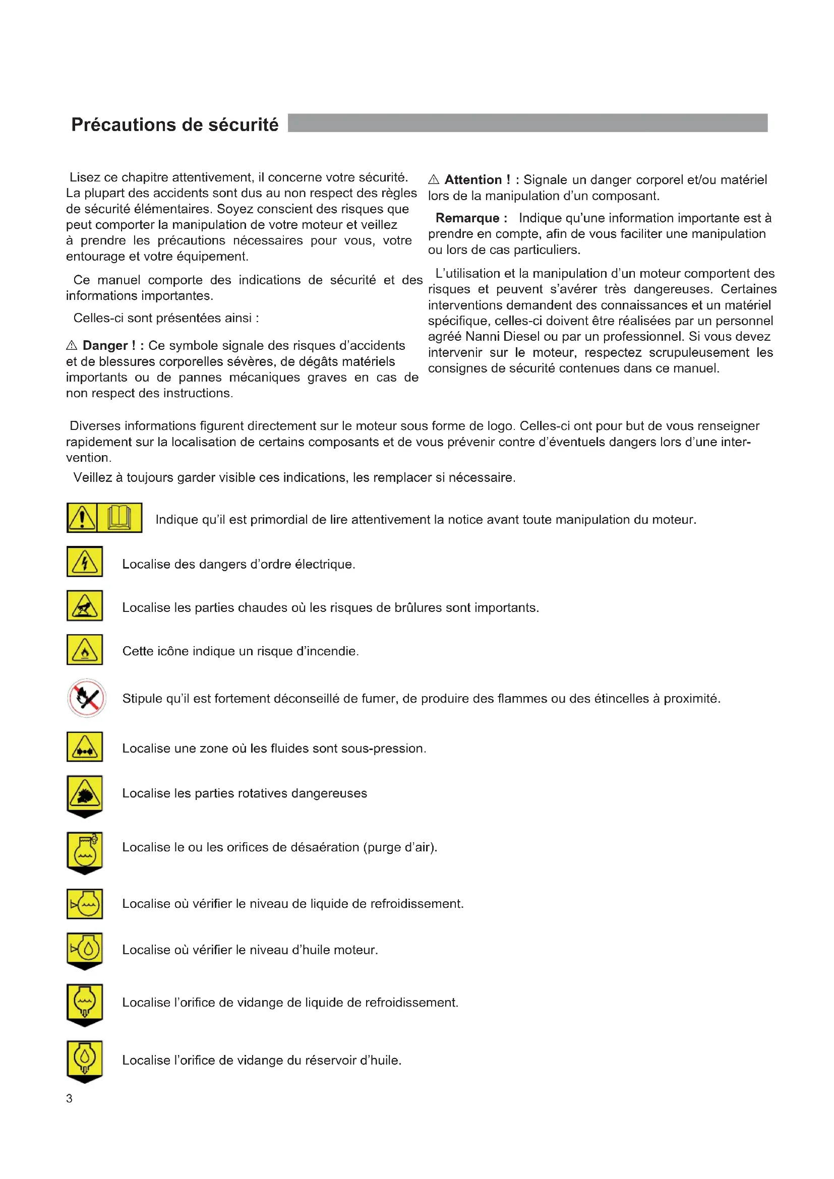 - Caractéristiques techniques Précautions de sécurité Lisez ce chapitre attentivement, il concerne votre sécurité. La plupart des accidents sont dus au non respect des règles de sécurité élémentaires. Soyez conscient des risques que peut comporter la manipulation de votre moteur et veillez à prendre les précautions nécessaires pour vous, votre entourage et votre équipement. Ce manuel comporte des indications de sécurité et des informations importantes. Celles-ci sont présentées ainsi : I Danger ! : Ce symbole signale des risques d’accidents et de blessures corporelles sévères, de dégâts matériels importants ou de pannes mécaniques graves en cas de non respect des instructions. I Attention ! : Signale un danger corporel et/ou matériel lors de la manipulation d’un composant. Remarque : Indique qu’une information importante est à prendre en compte, afin de vous faciliter une manipulation ou lors de cas particuliers. L’utilisation et la manipulation d’un moteur comportent des risques et peuvent s’avérer très dangereuses. Certaines interventions demandent des connaissances et un matériel spécifique, celles-ci doivent être réalisées par un personnel agréé Nanni Diesel ou par un professionnel. Si vous devez intervenir sur le moteur, respectez scrupuleusement les consignes de sécurité contenues dans ce manuel. Diverses informations figurent directement sur le moteur sous forme de logo. Celles-ci ont pour but de vous renseigner rapidement sur la localisation de certains composants et de vous prévenir contre d’éventuels dangers lors d’une inter- vention. Veillez à toujours garder visible ces indications, les remplacer si nécessaire. Localise où vérifier le niveau de liquide de refroidissement. Indique qu’il est primordial de lire attentivement la notice avant toute manipulation du moteur. Localise des dangers d’ordre électrique. Localise les parties chaudes où les risques de brûlures sont importants. Cette icône indique un risque d’incendie. Stipule qu’il est fortement déconseillé de fumer, de produire des flammes ou des étincelles à proximité. Localise une zone où les fluides sont sous-pression. Localise les parties rotatives dangereuses Localise le ou les orifices de désaération (purge d’air). Localise où vérifier le niveau d’huile moteur. Localise l’orifice de vidange de liquide de refroidissement. Localise l’orifice de vidange du réservoir d’huile. 3I Gaz d’échappement Les gaz d’échappement contiennent du monoxyde de carbone. Ce gaz incolore et inodore est extrêmement nocif et peut entrainer un empoisonnement pouvant causer des pertes de conscience ou la mort. Les premiers symptômes d’une intoxication au monoxyde de carbone sont les suivants : p. 30