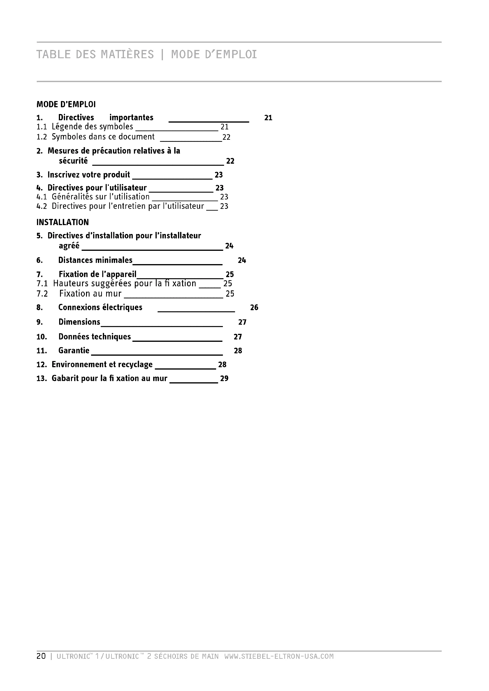 Veuillez lire ce manuel dans son intégralité. Le non- respect des directives contenues dans les guides, les directives et les règlements pourrait entraîner des dégâts matériels ou des blessures. Des installations, réglages, modifi cations, entretiens et utilisations non conformes de cet appareil pourraient provoquer des blessures graves.Cet appareil doit être installé par un électricien et un plombier agréés. L’installation doit se faire conformément aux codes de l’électricité et de la plomberie en vigueur au niveau national, provincial et local. Il incombe à l'installateur de veiller à ce que l'installation soit faite correctement. Le non-respect des directives d’installation et du mode d’emploi, ou une utilisation incorrecte aura pour effet d’annuler la garantie. » Conserver ces instructions pour consultation ultérieure. L’installateur doit laisser ces instructions au consommateur.Pour toute question relative à l’installation, l’utilisation ou le fonctionnement de ce séchoir de mains, ou si vous avez besoin de manuels d’installation supplémentaire, veuillez vous adresser à notre service technique en composant le (800) 582-8423 (Canada et États-Unis uniquement). Si vous appelez depuis un pays autre que le Canada ou les États-Unis, veuillez composer le +1 413-247-3380 et nous vous donnerons les coordonnées d’un représentant de l’entretien agréé de Stiebel Eltron dans votre région.
