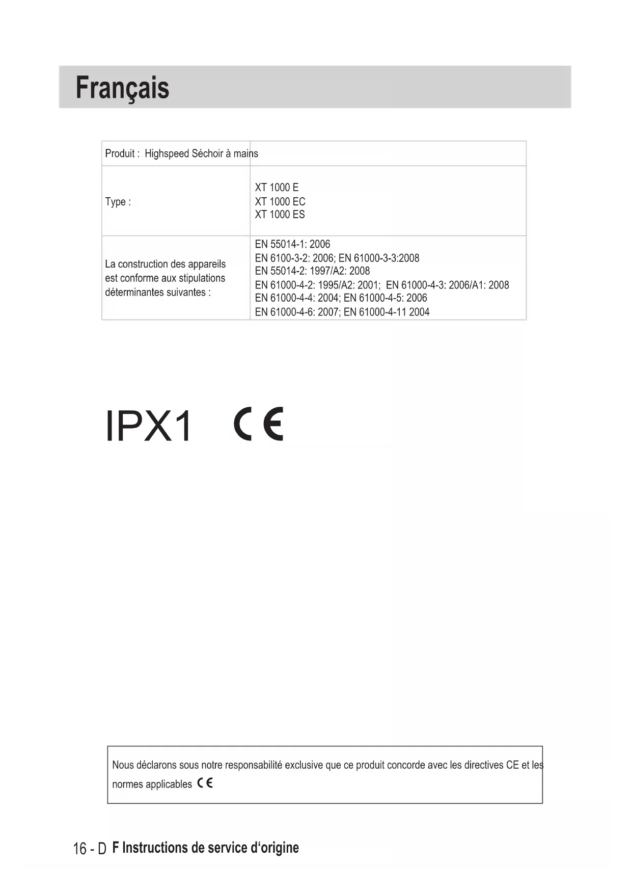 Nous déclarons sous notre responsabilité exclusive que ce produit concorde avec les directives CE et les normes applicables.