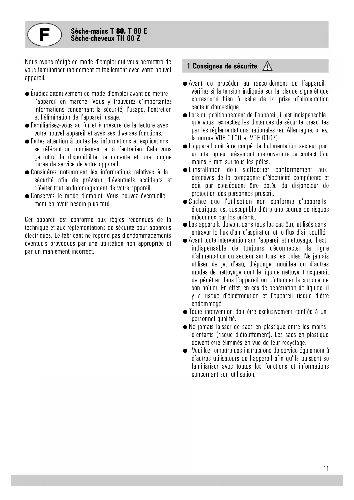 Le montage du sèche-mains et du sèche-cheveux à air chaud doit être confié à un spécialiste pourgarantir que le raccordement de l'appareil est conforme aux prescriptions de sécurité. Pour le T 80 et le TH 80 Z, prévoir dans l'installation électrique un commutateur LS ou un fusible de sécurité. Prévoir également un dispositif bipolaire de séparation du secteur avec un intervalle de coupure d'au moins 3 mm à chaque pôle.