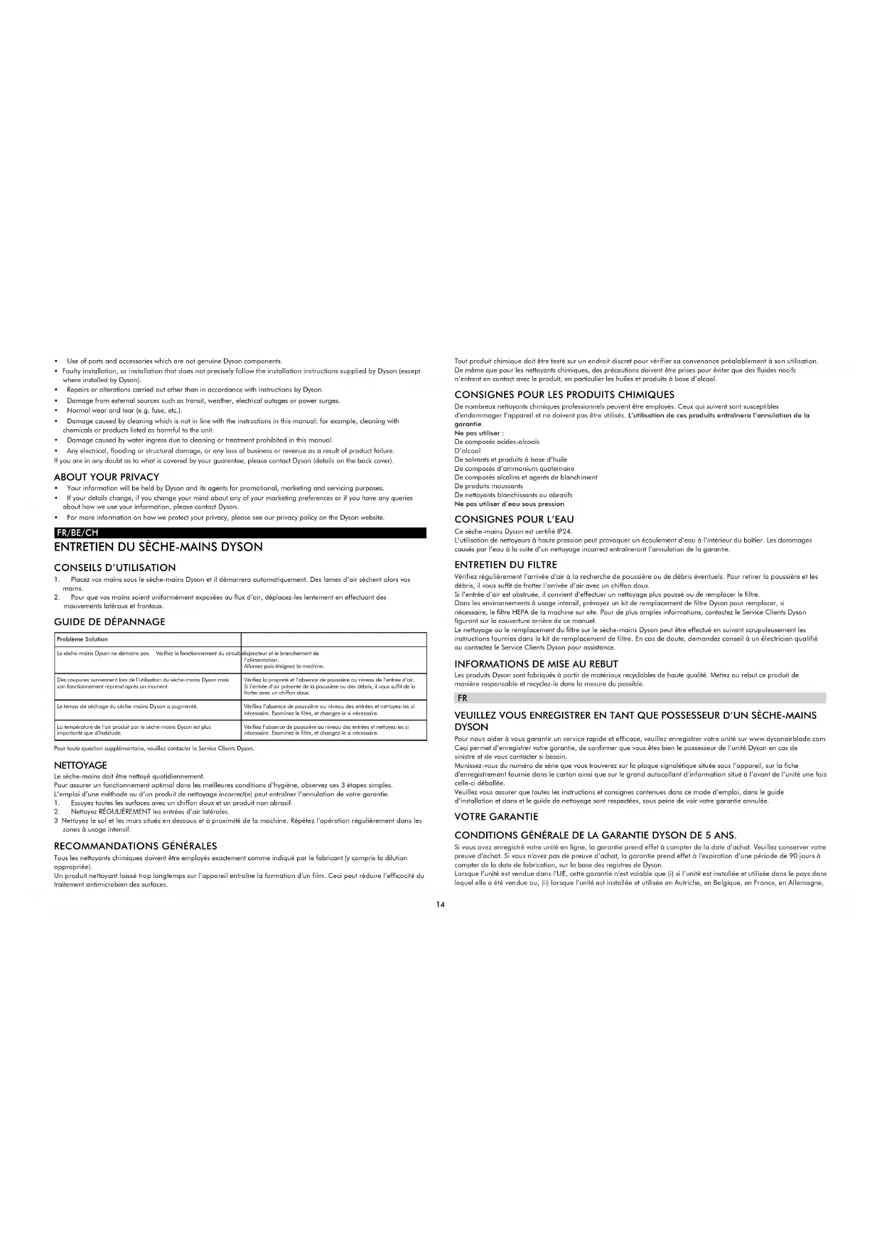 VEUILLEZ VOUS ENREGISTRER EN TANT QUE POSSESSEUR D’UN SÈCHE-MAINS DYSON Pour nous aider à vous garantir un service rapide et efficace, veuillez enregistrer votre unité sur www.dysonairblade.com Ceci permet d’enregistrer votre garantie, de confirmer que vous êtes bien le possesseur de l’unité Dyson en cas de sinistre et de vous contacter si besoin. Munissez-vous du numéro de série que vous trouverez sur la plaque signalétique située sous l’appareil, sur la fiche d’enregistrement fournie dans le carton ainsi que sur le grand autocollant d’information situé à l’avant de l’unité une fois celle-ci déballée. Veuillez vous assurer que toutes les instructions et consignes contenues dans ce mode d’emploi, dans le guide d’installation dans et le guide de nettoyage sont respectées, sous peine de voir votre garantie annulée. VOTRE GARANTIE CONDITIONS GÉNÉRALES DE LA GARANTIE DYSON DE 5ANS. Si vous avez enregistré votre appareil en ligne, la garantie prend effet à compter de la date d’achat. Veuillez conserver votre preuve d’achat. Si vous n’avez pas de preuve d’achat, la garantie prend effet à l’expiration d’une période de 90jours à compter de la date de fabrication, sur la base des registres de Dyson. Lorsque l’appareil est vendu dans l’UE, cette garantie n’est valable que (i) si l’appareil est installé et utilisé dans le pays dans lequel il a été vendu ou, (ii) si l’appareil est installé et utilisé en Autriche, en Belgique, en France, en Allemagne, en Irlande, en Italie, aux Pays-Bas, en Espagne ou au Royaume-Uni, et le même modèle que cet appareil est vendu pour une tension nominale pareille dans le pays respectif. Lorsque l’appareil est vendu en dehors de l’UE, cette garantie n’est valable que si l’appareil est installé et utilisé dans le pays dans lequel il a été vendu.