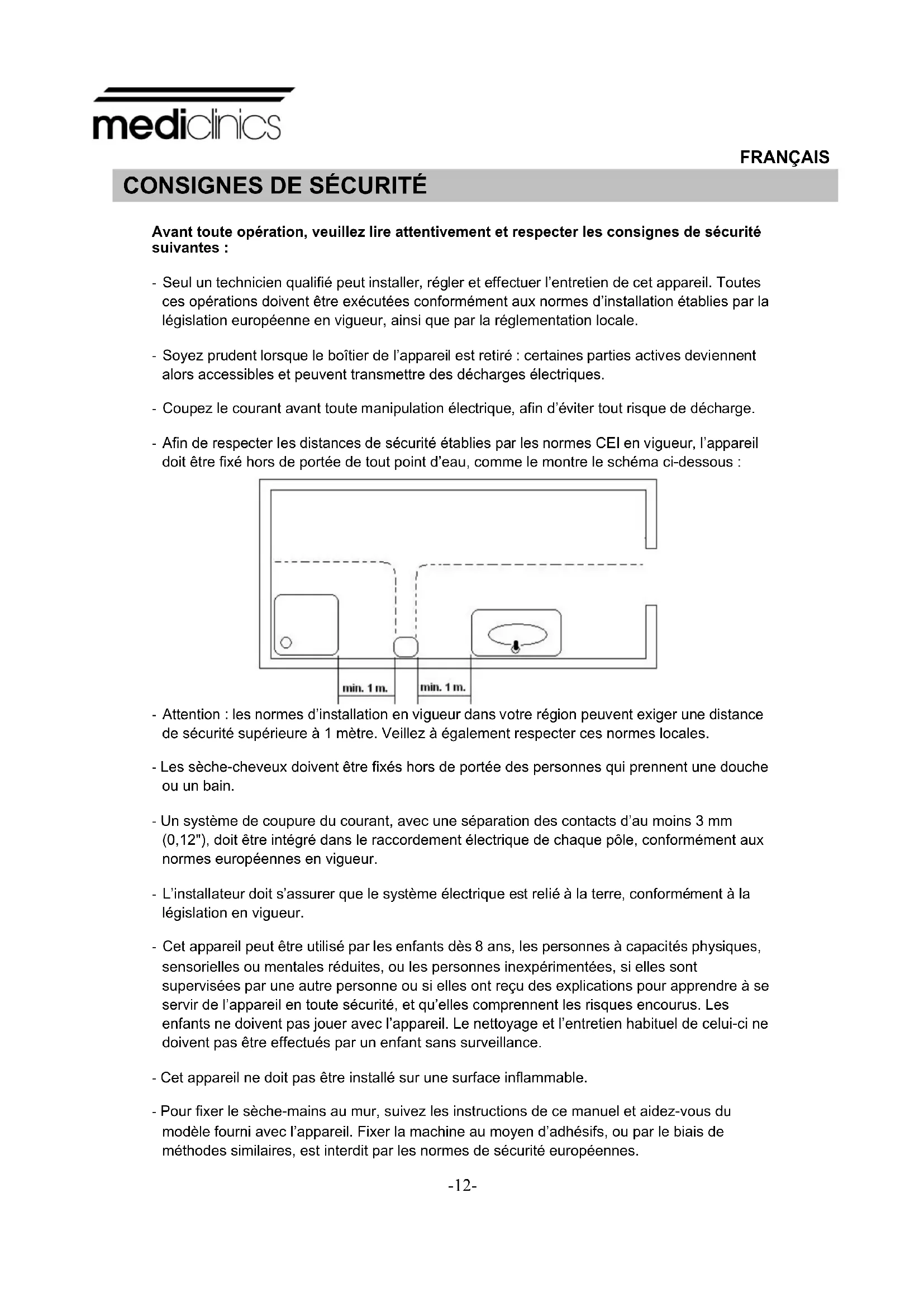 - Attention : les normes d’installation en vigueur dans votre région peuvent exiger une distance de sécurité supérieure à 1 mètre. Veillez à également respecter ces normes locales. - Les sèche-cheveux doivent être fixés hors de portée des personnes qui prennent une douche ou un bain. - Un système de coupure du courant, avec une séparation des contacts d’au moins 3 mm (0,12"), doit être intégré dans le raccordement électrique de chaque pôle, conformément aux normes européennes en vigueur. - L’installateur doit s’assurer que le système électrique est relié à la terre, conformément à la législation en vigueur. - Cet appareil peut être utilisé par les enfants dès 8 ans, les personnes à capacités physiques, sensorielles ou mentales réduites, ou les personnes inexpérimentées, si elles sont supervisées par une autre personne ou si elles ont reçu des explications pour apprendre à se servir de l’appareil en toute sécurité, et qu’elles comprennent les risques encourus. Les enfants ne doivent pas jouer avec l’appareil. Le nettoyage et l’entretien habituel de celui-ci ne doivent pas être effectués par un enfant sans surveillance. - Cet appareil ne doit pas être installé sur une surface inflammable. - Pour fixer le sèche-mains au mur, suivez les instructions de ce manuel et aidez-vous du modèle fourni avec l’appareil. Fixer la machine au moyen d’adhésifs, ou par le biais de méthodes similaires, est interdit par les normes de sécurité européennes.