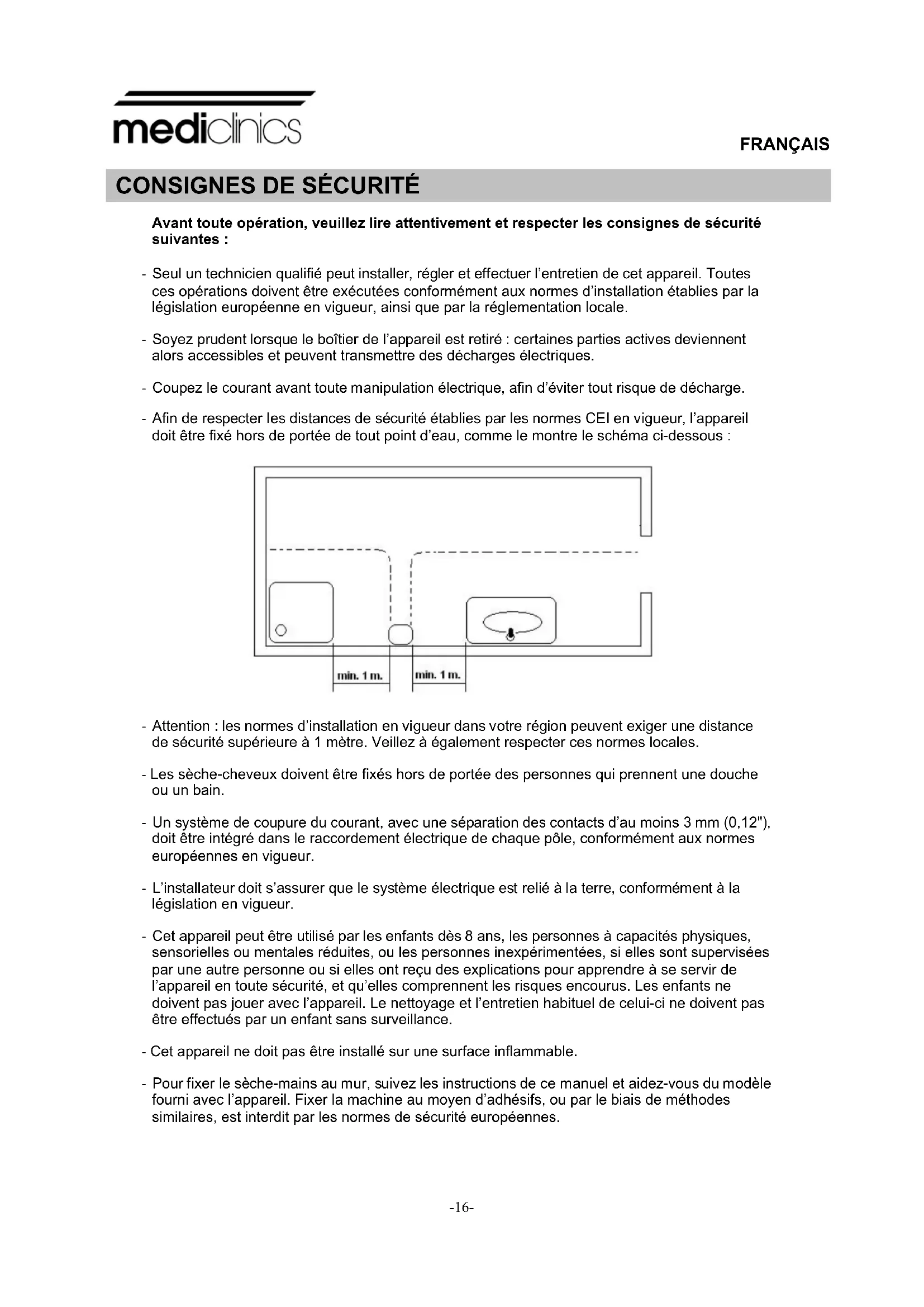 - Attention : les normes d’installation en vigueur dans votre région peuvent exiger une distance de sécurité supérieure à 1 mètre. Veillez à également respecter ces normes locales. - Les sèche-cheveux doivent être fixés hors de portée des personnes qui prennent une douche ou un bain. - Un système de coupure du courant, avec une séparation des contacts d’au moins 3 mm (0,12"), doit être intégré dans le raccordement électrique de chaque pôle, conformément aux normes européennes en vigueur. - L’installateur doit s’assurer que le système électrique est relié à la terre, conformément à la législation en vigueur. - Cet appareil peut être utilisé par les enfants dès 8 ans, les personnes à capacités physiques, sensorielles ou mentales réduites, ou les personnes inexpérimentées, si elles sont supervisées par une autre personne ou si elles ont reçu des explications pour apprendre à se servir de l’appareil en toute sécurité, et qu’elles comprennent les risques encourus. Les enfants ne doivent pas jouer avec l’appareil. Le nettoyage et l’entretien habituel de celui-ci ne doivent pas être effectués par un enfant sans surveillance. - Cet appareil ne doit pas être installé sur une surface inflammable. - Pour fixer le sèche-mains au mur, suivez les instructions de ce manuel et aidez-vous du modèle fourni avec l’appareil. Fixer la machine au moyen d’adhésifs, ou par le biais de méthodes similaires, est interdit par les normes de sécurité européennes.