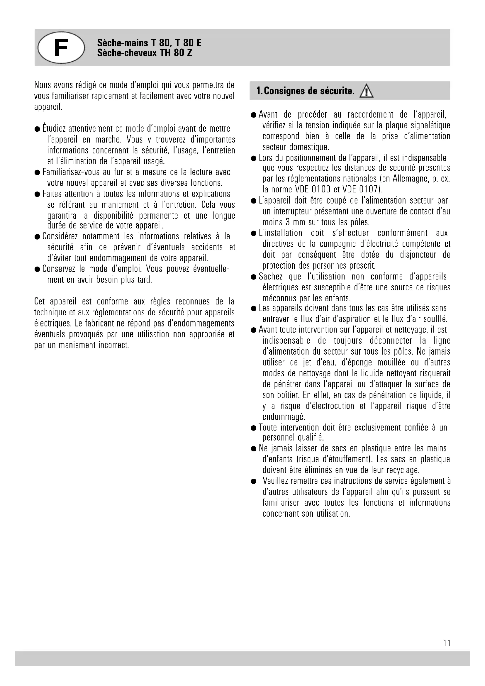 Le montage du séche-mains et du séche-cheveux à air chaud doit être confié à un spécialiste pour garantir que le raccordement de l'appareil est conforme aux prescriptions de sécurité. Pour le T 80 et le TH 80 Z, prévoir dans l'installation électrique un commutateur LS ou un fusible de sécurité. Prévoir également un dispositif bipolaire de séparation du secteur avec un intervalle de coupure d'au moins 3 mm à chaque pole.