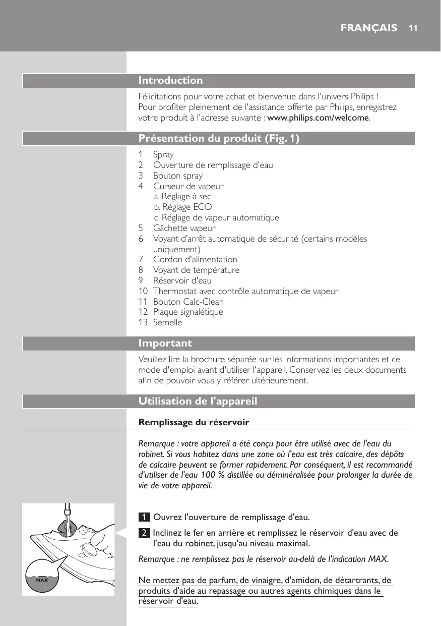 Spray Ouverture de remplissage d'eau Bouton spray Curseur de vapeur a. Réglage à sec b. Réglage ECO c. Réglage de vapeur automatique Gâchette vapeur Voyant d’arrêt automatique de sécurité (certains modèles uniquement) Cordon d'alimentation Voyant de température Réservoir d'eau Thermostat avec contrôle automatique de vapeur Bouton Calc-Clean Plaque signalétique Semelle Important Veuillez lire la brochure séparée sur les informations importantes et ce mode d'emploi avant d'utiliser l'appareil. Conservez les deux documents afin de pouvoir vous y référer ultérieurement. Utilisation de l'appareil Remplissage du réservoir Remarque : votre appareil a été conçu pour être utilisé avec de l'eau du robinet. Si vous habitez dans une zone où l'eau est très calcaire, des dépôts de calcaire peuvent se former rapidement. Par conséquent, il est recommandé d'utiliser de l'eau 100 % distillée ou déminéralisée pour prolonger la durée de vie de votre appareil. 1 Ouvrez l'ouverture de remplissage d'eau. 2 Inclinez le fer en arrière et remplissez le réservoir d'eau avec de l'eau du robinet, jusqu'au niveau maximal. Remarque : ne remplissez pas le réservoir au-delà de l'indication MAX. Ne mettez pas de parfum, de vinaigre, d'amidon, de détartrants, de produits d'aide au repassage ou autres agents chimiques dans le réservoir d'eau.
