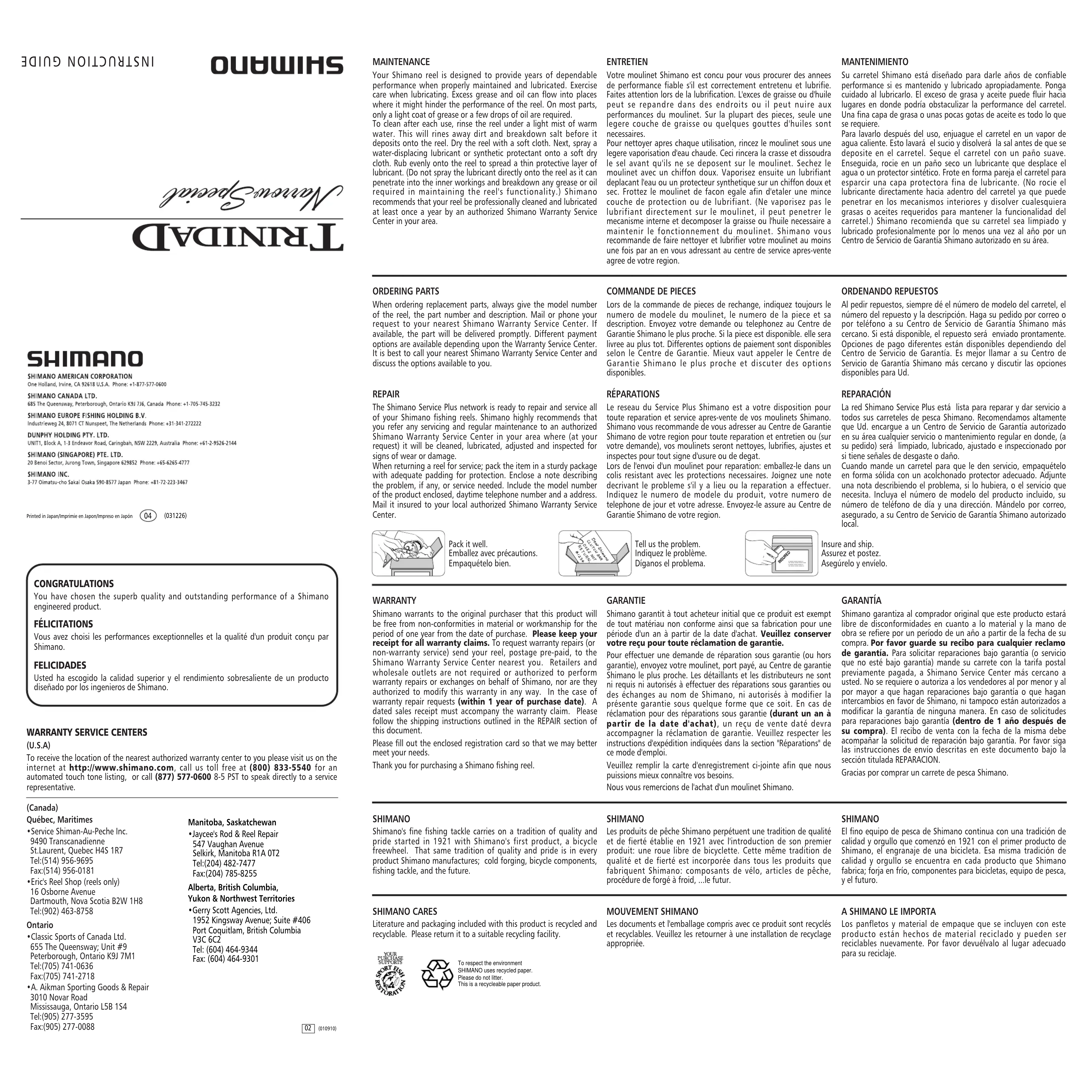 Lors de l'envoi d'un moulinet pour reparation: emballez-le dans un colis resistant avec les protections nécessaires. Joignez une note decrivant le problème s'il y a lieu ou la reparation a effectuer. Indiquez le numero de modele du produit, votre numero de téléphone de jour et votre adresse. Envoyez-le assure au Centre de Garantie Shimano de votre region.