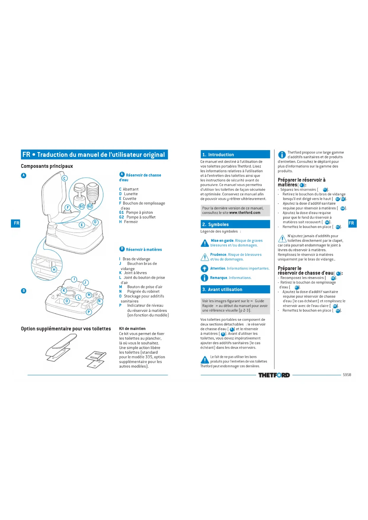 Ce manuel est destiné à l’utilisation de vos toilettes portables Thetford. Lisez les informations relatives à l'utilisation et à l'entretien des toilettes ainsi que les instructions de sécurité avant de poursuivre. Ce manuel vous permettra d’utiliser les toilettes de façon sécurisée et optimisée. Conservez ce manuel afin de pouvoir vous y référer ultérieurement.Pour la dernière version de ce manuel, consultez le site www.thetford.com