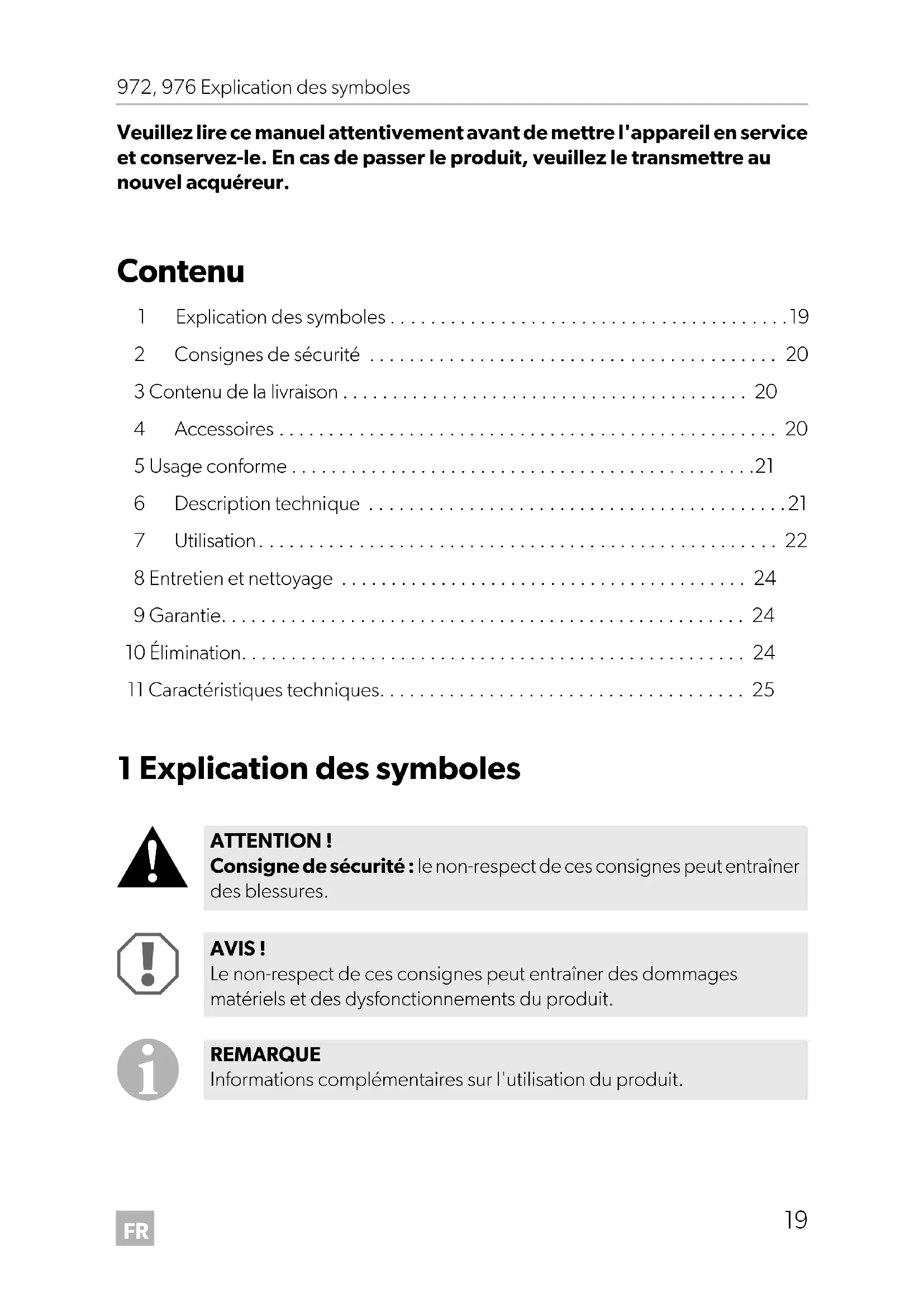 - Veuillez lire ce manuel attentivement avant de mettre l'appareil en service et conservez-le. En cas de passer le produit, veuillez le transmettre au nouvel acquéreur. Contenu 1 Explication des symboles p. 19