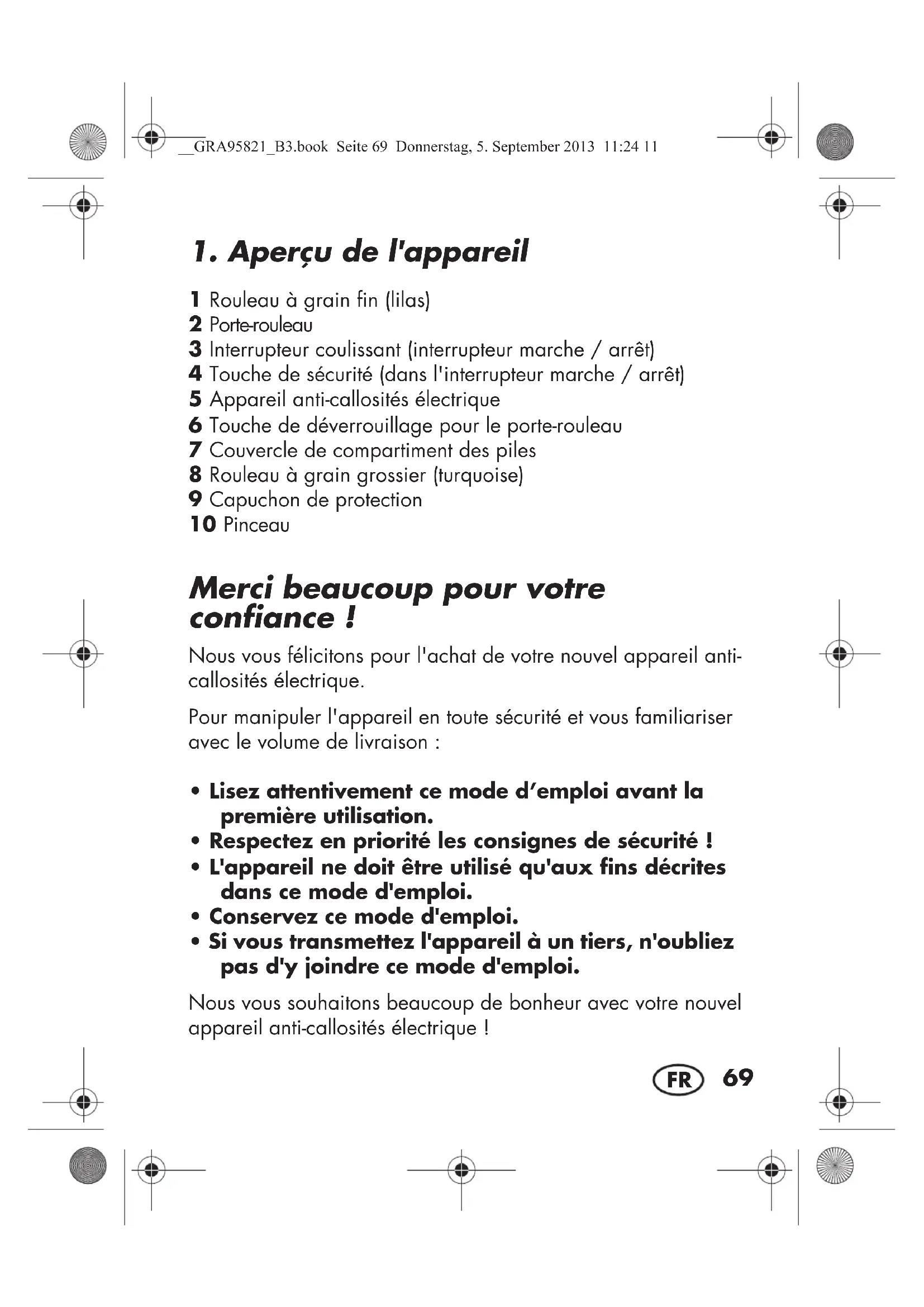 - Si vous transmettez l'appareil à un tiers, n'oubliez pas d'y joindre ce mode d'emploi. Nous vous souhaitons beaucoup de bonheur avec votre nouvel appareil anti-callosités électrique ! __GRA95821_B3.book Seite 69 Donnerstag, 5. September 2013 11:24 1170