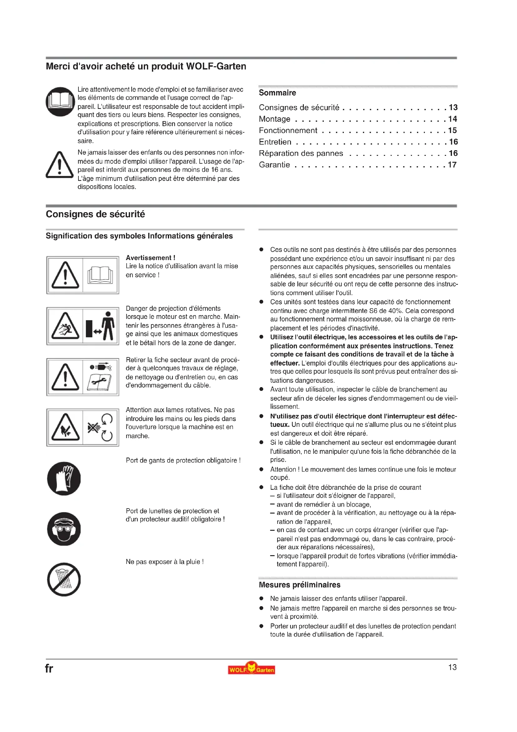 Faire réparer ou remplaçer les pieces endommagées (utiliser exclusivement des pieces de rechange originales WOLF-Garten).