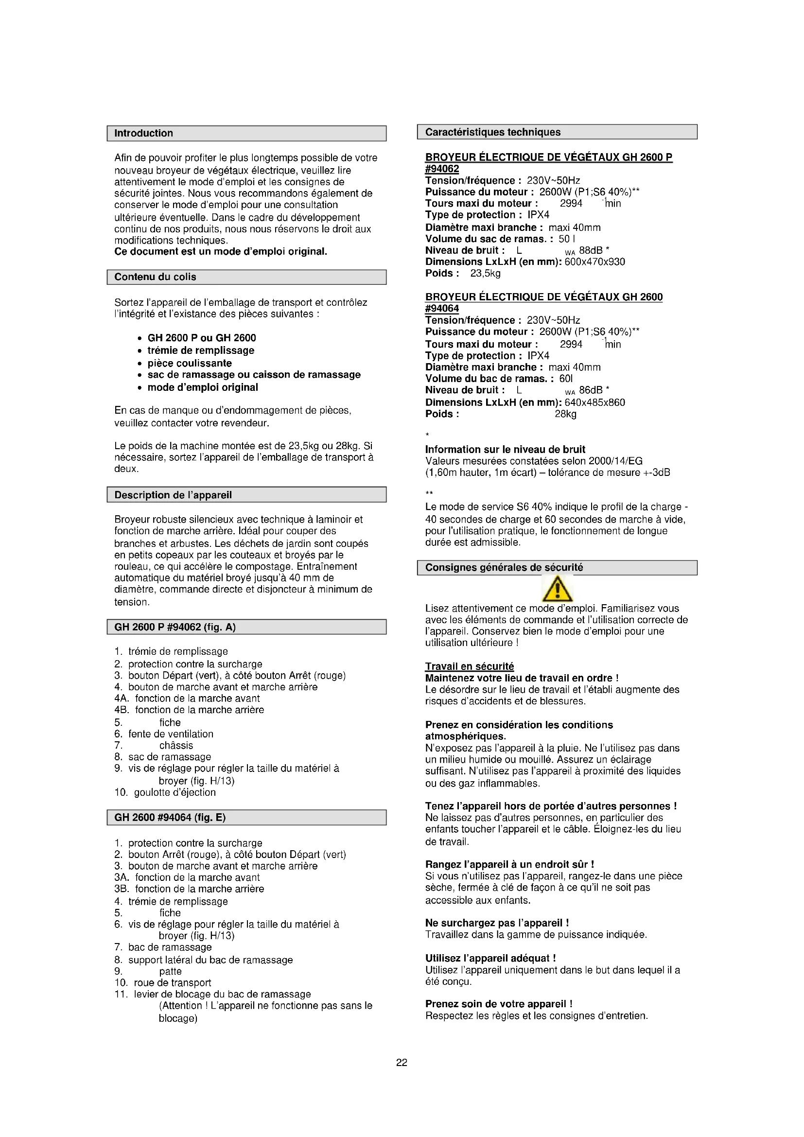 (Attention ! L’appareil ne fonctionne pas sans le blocage) Caractéristiques techniques BROYEUR ÉLECTRIQUE DE VÉGÉTAUX GH 2600 P #94062 Tension/fréquence : 230V~50Hz Puissance du moteur : 2600W (P1;S6 40%)** Tours maxi du moteur : 2994 min