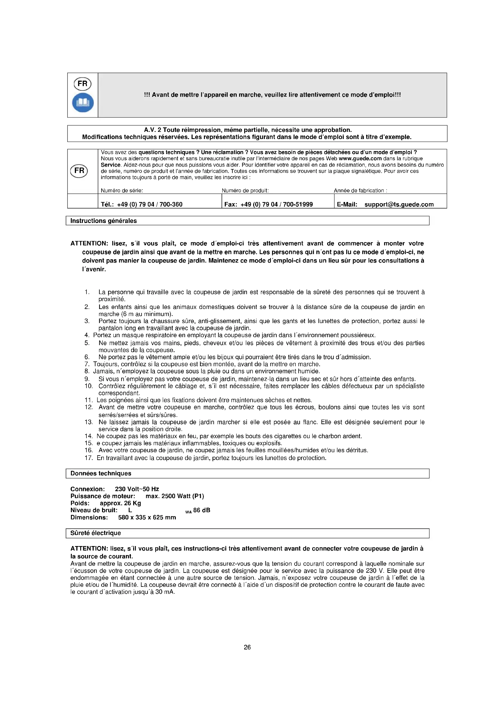 Tél.: +49 (0) 79 04 / 700-360 Fax: +49 (0) 79 04 / 700-51999 E-Mail: support@ts.guede.com Instructions générales ATTENTION: lisez, s´il vous plaît, ce mode d´emploi-ci très attentivement avant de commencer à monter votre coupeuse de jardin ainsi que avant de la mettre en marche. Les personnes qui n´ont pas lu ce mode d´emploi-ci, ne doivent pas manier la coupeuse de jardin. Maintenez ce mode d´emploi-ci dans un lieu sûr pour les consultations à l´avenir.