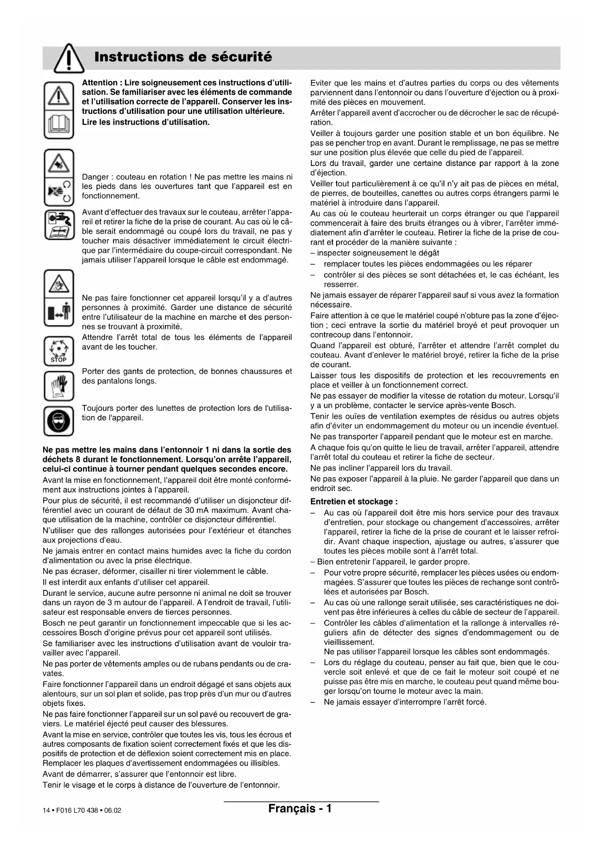 les pieds dans les ouvertures tant que l’appareil est en fonctionnement. Avant d’effectuer des travaux sur le couteau, arrêter l’appa- reil et retirer la fiche de la prise de courant. Au cas où le câ- ble serait endommagé ou coupé lors du travail, ne pas y toucher mais désactiver immédiatement le circuit électri- que par l’intermédiaire du coupe-circuit correspondant. Ne jamais utiliser l’appareil lorsque le câble est endommagé. Ne pas faire fonctionner cet appareil lorsqu’il y a d’autres personnes à proximité. Garder une distance de sécurité entre l’utilisateur de la machine en marche et des person- nes se trouvant à proximité. Attendre l’arrêt total de tous les éléments de l’appareil avant de les toucher. Porter des gants de protection, de bonnes chaussures et des pantalons longs. Toujours porter des lunettes de protection lors de l'utilisa- tion de l'appareil. Ne pas mettre les mains dans l’entonnoir 1 ni dans la sortie des déchets 8 durant le fonctionnement. Lorsqu’on arrête l’appareil, celui-ci continue à tourner pendant quelques secondes encore. Avant la mise en fonctionnement, l’appareil doit être monté conformé- ment aux instructions jointes à l’appareil. Pour plus de sécurité, il est recommandé d’utiliser un disjoncteur dif- férentiel avec un courant de défaut de 30 mA maximum. Avant cha- que utilisation de la machine, contrôler ce disjoncteur différentiel. N’utiliser que des rallonges autorisées pour l’extérieur et étanches aux projections d’eau. Ne jamais entrer en contact mains humides avec la fiche du cordon d’alimentation ou avec la prise électrique. Ne pas écraser, déformer, cisailler ni tirer violemment le câble. Il est interdit aux enfants d’utiliser cet appareil. Durant le service, aucune autre personne ni animal ne doit se trouver dans un rayon de 3 m autour de l’appareil. A l’endroit de travail, l’utili- sateur est responsable envers de tierces personnes. Bosch ne peut garantir un fonctionnement impeccable que si les ac- cessoires Bosch d’origine prévus pour cet appareil sont utilisés. Se familiariser avec les instructions d’utilisation avant de vouloir tra- vailler avec l’appareil. Ne pas porter de vêtements amples ou de rubans pendants ou de cra- vates. Faire fonctionner l’appareil dans un endroit dégagé et sans objets aux alentours, sur un sol plan et solide, pas trop près d’un mur ou d’autres objets fixes. Ne pas faire fonctionner l’appareil sur un sol pavé ou recouvert de gra- viers. Le matériel éjecté peut causer des blessures. Avant la mise en service, contrôler que toutes les vis, tous les écrous et autres composants de fixation soient correctement fixés et que les dis- positifs de protection et de déflexion soient correctement mis en place. Remplacer les plaques d’avertissement endommagées ou illisibles. Avant de démarrer, s’assurer que l’entonnoir est libre. Tenir le visage et le corps à distance de l’ouverture de l’entonnoir. Eviter que les mains et d’autres parties du corps ou des vêtements parviennent dans l’entonnoir ou dans l’ouverture d’éjection ou à proxi- mité des pièces en mouvement. Arrêter l’appareil avent d’accrocher ou de décrocher le sac de récupé- ration. Veiller à toujours garder une position stable et un bon équilibre. Ne pas se pencher trop en avant. Durant le remplissage, ne pas se mettre sur une position plus élevée que celle du pied de l’appareil. Lors du travail, garder une certaine distance par rapport à la zone d’éjection. Veiller tout particulièrement à ce qu’il n’y ait pas de pièces en métal, de pierres, de bouteilles, canettes ou autres corps étrangers parmi le matériel à introduire dans l’appareil. Au cas où le couteau heurterait un corps étranger ou que l’appareil commencerait à faire des bruits étranges ou à vibrer, l’arrêter immé- diatement afin d’arrêter le couteau. Retirer la fiche de la prise de cou- rant et procéder de la manière suivante : – inspecter soigneusement le dégât – remplacer toutes les pièces endommagées ou les réparer – contrôler si des pièces se sont détachées et, le cas échéant, les resserrer. Ne jamais essayer de réparer l’appareil sauf si vous avez la formation nécessaire. Faire attention à ce que le matériel coupé n’obture pas la zone d’éjec- tion ; ceci entrave la sortie du matériel broyé et peut provoquer un contrecoup dans l’entonnoir. Quand l’appareil est obturé, l’arrêter et attendre l’arrêt complet du couteau. Avant d’enlever le matériel broyé, retirer la fiche de la prise de courant. Laisser tous les dispositifs de protection et les recouvrements en place et veiller à un fonctionnement correct. Ne pas essayer de modifier la vitesse de rotation du moteur. Lorsqu’il y a un problème, contacter le service après-vente Bosch. Tenir les ouïes de ventilation exemptes de résidus ou autres objets afin d’éviter un endommagement du moteur ou un incendie éventuel. Ne pas transporter l’appareil pendant que le moteur est en marche. A chaque fois qu’on quitte le lieu de travail, arrêter l’appareil, attendre l’arrêt total du couteau et retirer la fiche de secteur. Ne pas incliner l’appareil lors du travail. Ne pas exposer l’appareil à la pluie. Ne garder l’appareil que dans un endroit sec. Entretien et stockage : – Au cas où l’appareil doit être mis hors service pour des travaux d’entretien, pour stockage ou changement d’accessoires, arrêter l’appareil, retirer la fiche de la prise de courant et le laisser refroi- dir. Avant chaque inspection, ajustage ou autres, s’assurer que toutes les pièces mobile sont à l’arrêt total. – Bien entretenir l’appareil, le garder propre. – Pour votre propre sécurité, remplacer les pièces usées ou endom- magées. S’assurer que toutes les pièces de rechange sont contrô- lées et autorisées pa