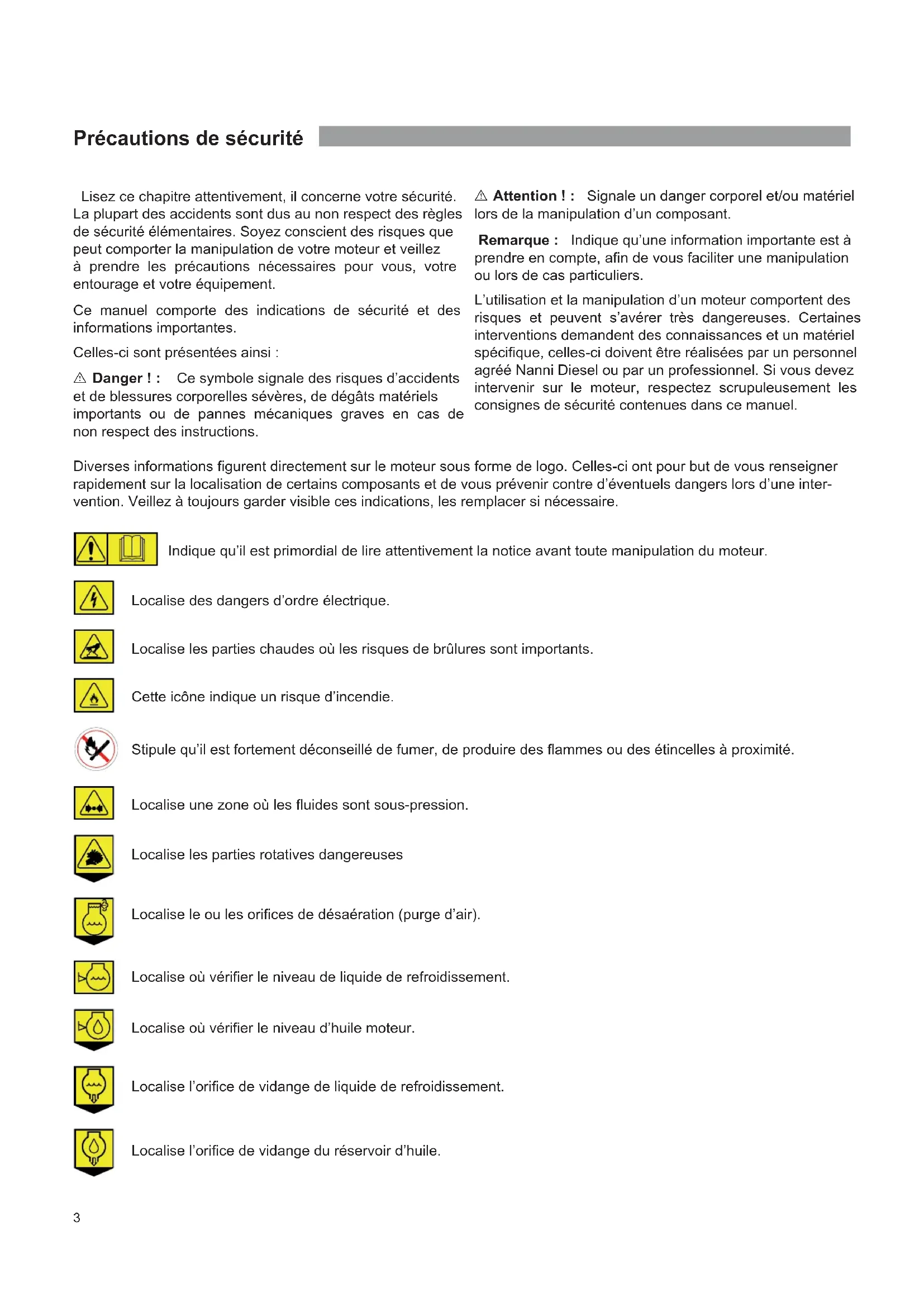 L'utilisation et la manipulation d'un moteur comportent des risques et peuvent s'avérer très dangereuses. Certaines interventions demandent des connaissances et un matériel spécifique ; celles-ci doivent être réalisées par un personnel agréé Nanni Diesel ou par un professionnel. Si vous devez intervenir sur le moteur, respectez scrupuleusement les consignes de sécurité contenues dans ce manuel.