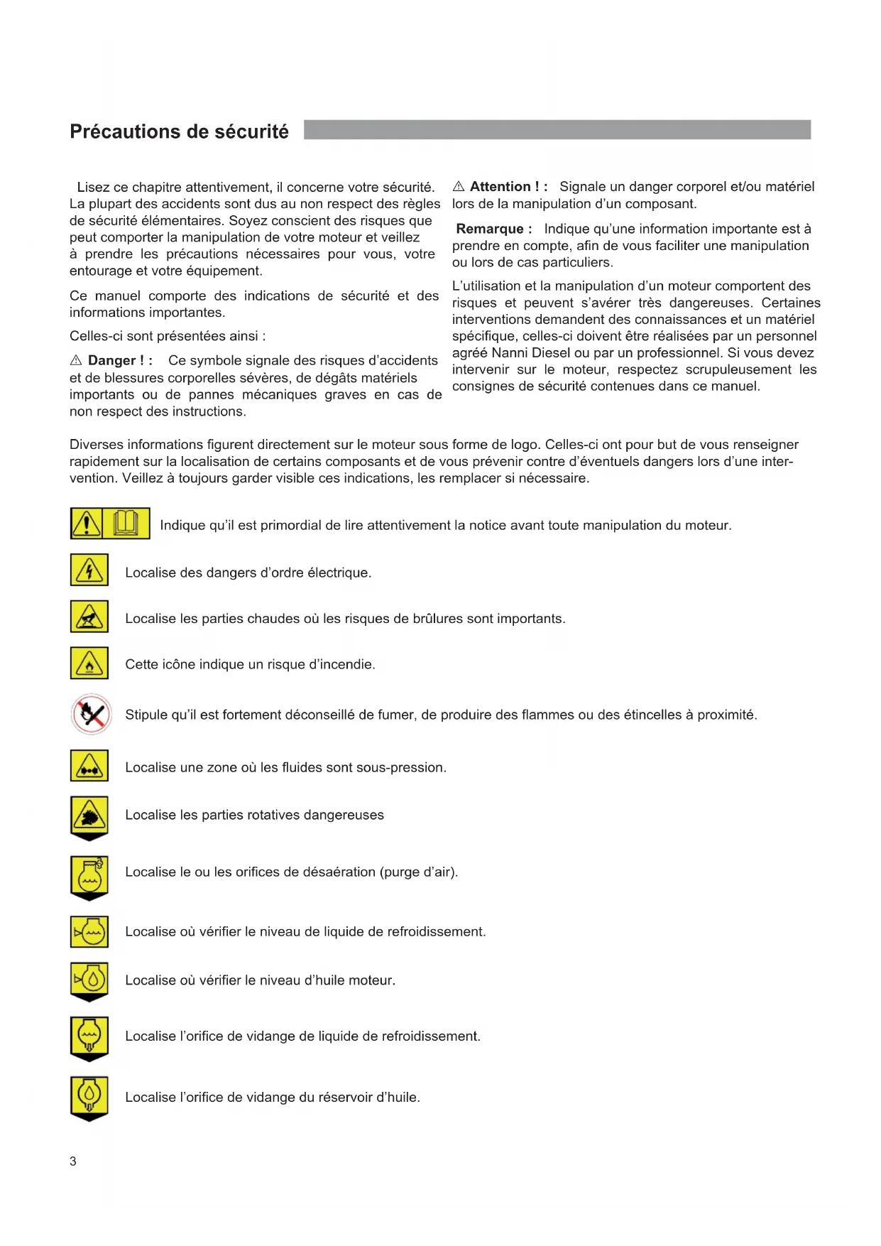 - Caractéristiques techniques Précautions de sécurité Lisez ce chapitre attentivement, il concerne votre sécurité. La plupart des accidents sont dus au non respect des règles de sécurité élémentaires. Soyez conscient des risques que peut comporter la manipulation de votre moteur et veillez à prendre les précautions nécessaires pour vous, votre entourage et votre équipement. Ce manuel comporte des indications de sécurité et des informations importantes. Celles-ci sont présentées ainsi : I Danger ! : Ce symbole signale des risques d’accidents et de blessures corporelles sévères, de dégâts matériels importants ou de pannes mécaniques graves en cas de non respect des instructions. I Attention ! : Signale un danger corporel et/ou matériel lors de la manipulation d’un composant. Remarque : Indique qu’une information importante est à prendre en compte, afin de vous faciliter une manipulation ou lors de cas particuliers. L’utilisation et la manipulation d’un moteur comportent des risques et peuvent s’avérer très dangereuses. Certaines interventions demandent des connaissances et un matériel spécifique, celles-ci doivent être réalisées par un personnel agréé Nanni Diesel ou par un professionnel. Si vous devez intervenir sur le moteur, respectez scrupuleusement les consignes de sécurité contenues dans ce manuel. Diverses informations figurent directement sur le moteur sous forme de logo. Celles-ci ont pour but de vous renseigner rapidement sur la localisation de certains composants et de vous prévenir contre d’éventuels dangers lors d’une inter- vention. Veillez à toujours garder visible ces indications, les remplacer si nécessaire. Localise où vérifier le niveau de liquide de refroidissement. Indique qu’il est primordial de lire attentivement la notice avant toute manipulation du moteur. Localise des dangers d’ordre électrique. Localise les parties chaudes où les risques de brûlures sont importants. Cette icône indique un risque d’incendie. Stipule qu’il est fortement déconseillé de fumer, de produire des flammes ou des étincelles à proximité. Localise une zone où les fluides sont sous-pression. Localise les parties rotatives dangereuses Localise le ou les orifices de désaération (purge d’air). Localise où vérifier le niveau d’huile moteur. Localise l’orifice de vidange de liquide de refroidissement. Localise l’orifice de vidange du réservoir d’huile. 3I Gaz d’échappement Les gaz d’échappement contiennent du monoxyde de carbone. Ce gaz incolore et inodore est extrêmement nocif et peut entraîner un empoisonnement pouvant causer des pertes de conscience ou la mort. Les premiers symptômes d’une intoxication au monoxyde de carbone sont les suivants : p. 30
