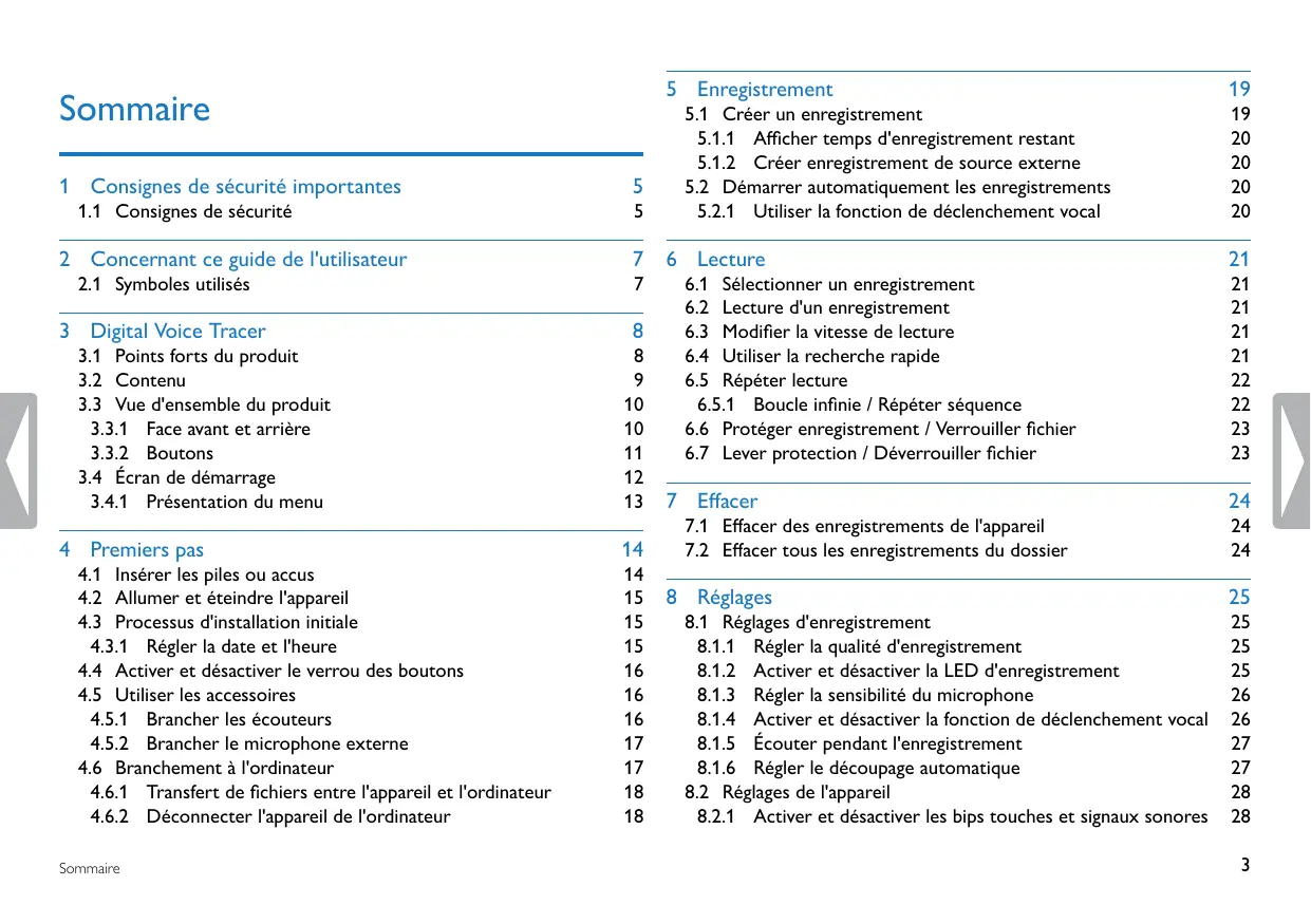 - Éliminez les anciens appareils dans des points de collecte appropriés. Ni Speech Processing Solutions GmbH ni les sociétés affiliées ne sont responsables envers l'acheteur de ce produit ou envers des tiers en ce qui concerne les réclamations pour dommages, pertes, coûts ou dépenses encourus par l'acheteur ou des tiers résultant d'un accident, d'une mauvaise utilisation ou d'une utilisation incorrecte de ce produit ou résultant de modifications ou de réparations non autorisées du produit, ou du non-respect des consignes d'utilisation et de maintenance fournies par Philips. Ce guide de l'utilisateur est un document sans valeur conventionnelle. Sous réserve d'erreur et de modification. Philips et le logo du blason Philips sont des marques déposées de Koninklijke Philips Electronics N.V. et sont utilisés par Speech Processing Solutions GmbH sous licence de Koninklijke Philips Electronics N.V. Toutes les marques utilisées sont propriétés de leurs propriétaires respectifs. Sommaire Sommaire