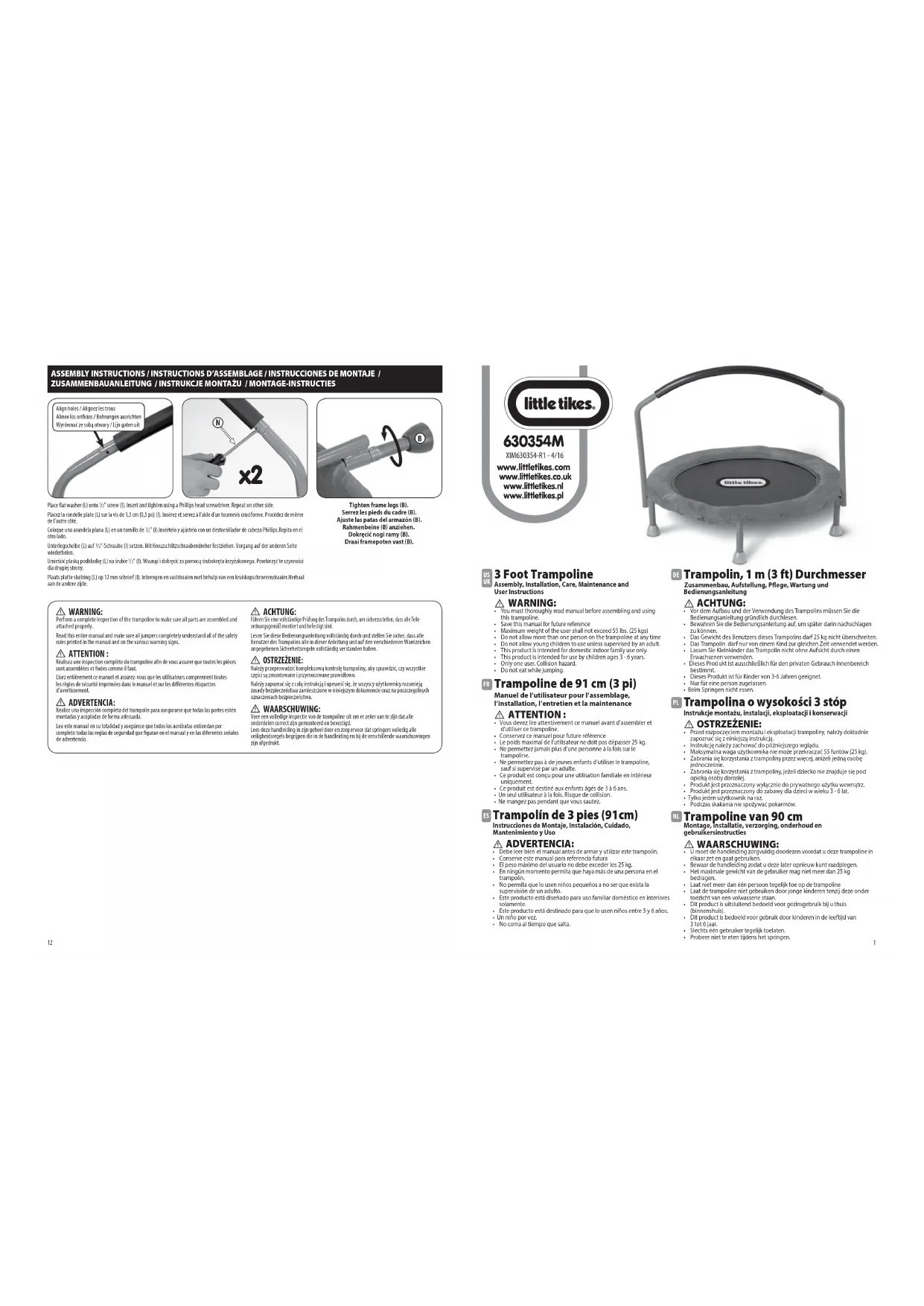 - vives et les remplacer si nécessaire.• les pièces concernées si nécessaire, conformément aux présentes instructions. SERVICE CONSOMMATEURS www.littletikes.com Little Tikes MGA Entertainment Netherlands BV klantenservice@mgae.com Téléphone : +31 (0) 172- 758 038 Télécopieur : +31 (0)172- 758 039 MINIMUM SIZE allowed is .2” high Updated 12.2.11 per Paul Madan (new spacing) Imprimé aux Chine. The Little Tikes Company fabrique des jouets amusants de qualité exceptionnelle. Nous garantissons à l’acheteur initial que la surface de rebond est exempte de défauts de matériau ou de fabrication, pendant 90 jours à compter de la date d’achat, et que toutes les pièces sont exemptes de défauts de matériau ou de fabrication pendant un (1) an* à compter de la date d’achat (le reçu de vente daté est exigé comme preuve d’achat). Au titre de la présente garantie, la responsabilité de The Little Tikes Company se limite au remplacement des pièces défectueuses ou au remplacement du produit, à la seule discrétion de la société. La présente garantie est valable uniquement si le produit a été assemblé et entretenu conformément aux instructions fournies. La présente garantie ne couvre ni les dommages résultant d’une utilisation abusive ou d’un accident, ni l’apparence esthétique telle les décolorations ou les rayures dues à l’usure normale ou à toute autre cause ne relevant pas de défauts de matériau ou de fabrication. États-Unis et Canada : Pour obtenir des informations sur le service de garantie ou de remplacement des pièces veuillez visiter notre site Web : www.littletikes.com, appeler le 1-800-321-0183 ou écrire à : Consumer Service, The Little Tikes Company, 2180 Barlow Road, Hudson OH 44236, U.S.A. Certaines pièces de rechange peuvent être achetées après l’expiration de la garantie – veuillez nous contacter pour obtenir de plus amples informations. *Garantie du trampoline : Nous garantissons à l’acheteur initial que la surface de rebond est exempte de défauts de matériau ou de fabrication, pendant 90 jours à compter de la date d’achat, et que toutes les pièces sont exemptes de défauts de matériau ou de fabrication pendant un (1) an* à compter de la date d’achat (le reçu de vente daté est exigé comme preuve d’achat). À l’extérieur des États-Unis et du Canada : veuillez contacter le magasin où le produit a été acheté pour vous informer sur le service de garantie. de province à province. Certaines provinces n’autorisent pas l’exclusion ou la limitation pour les dommages consécutifs ou fortuits, par conséquent la limitation ou l’exclusion qui précède peut ne pas s’appliquer à votre cas. Conservez ce manuel car il contient des informations importantes. ESPAÑOL