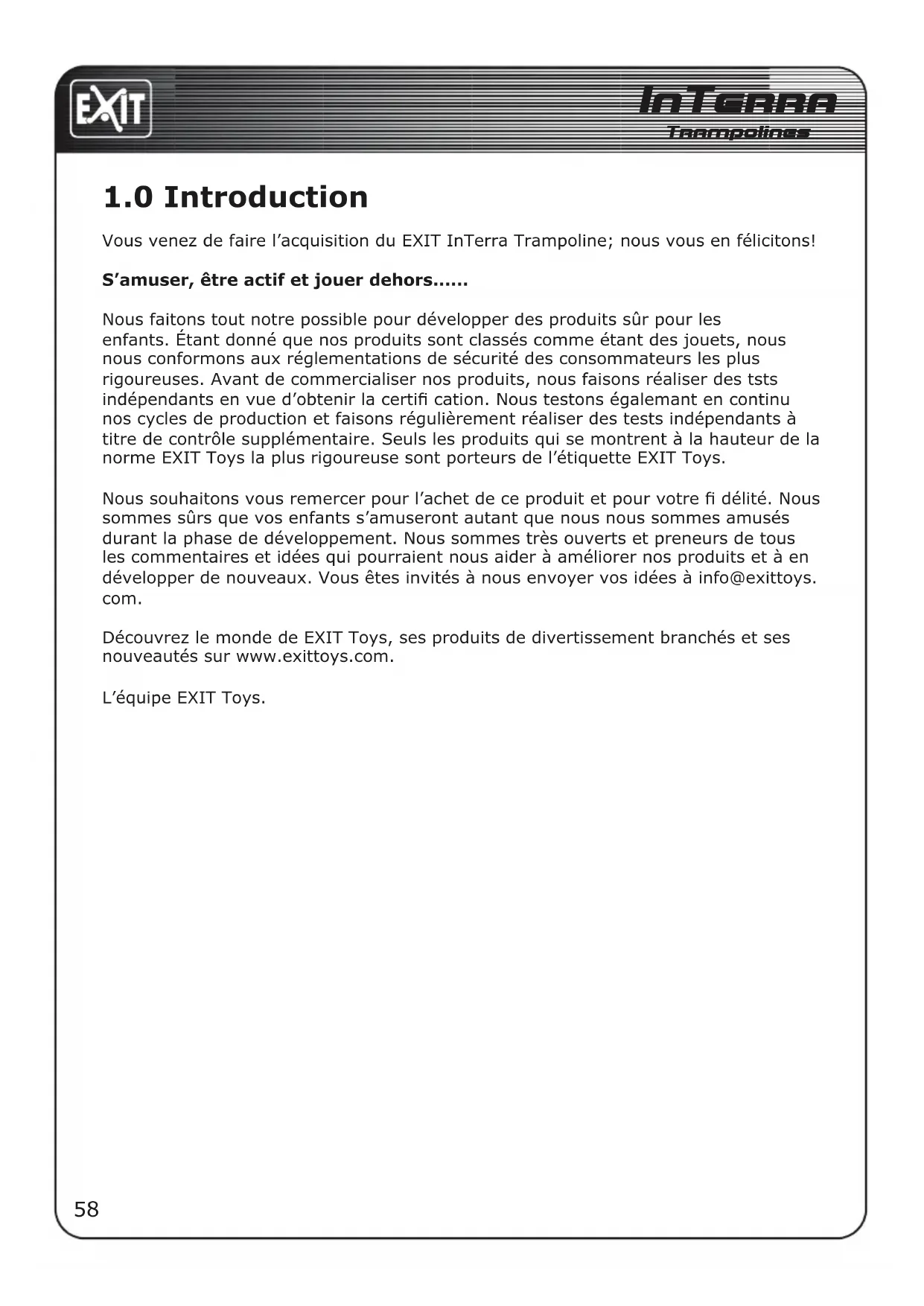 Nous souhaitons vous remercier pour l'achet de ce produit et pour votre fi déité. Nous sommes surs que vos enfants s'amuseront autant que nous nous sommes amusés durant la phase de développement. Nous sommes très ouverts et preneurs de tous les commentaires et idées qui poursaient nous aider à améliorer nos produits et à en développer de nouveaux. Vous étes invités à nous envoyer vos idées à info@exittoys. com.