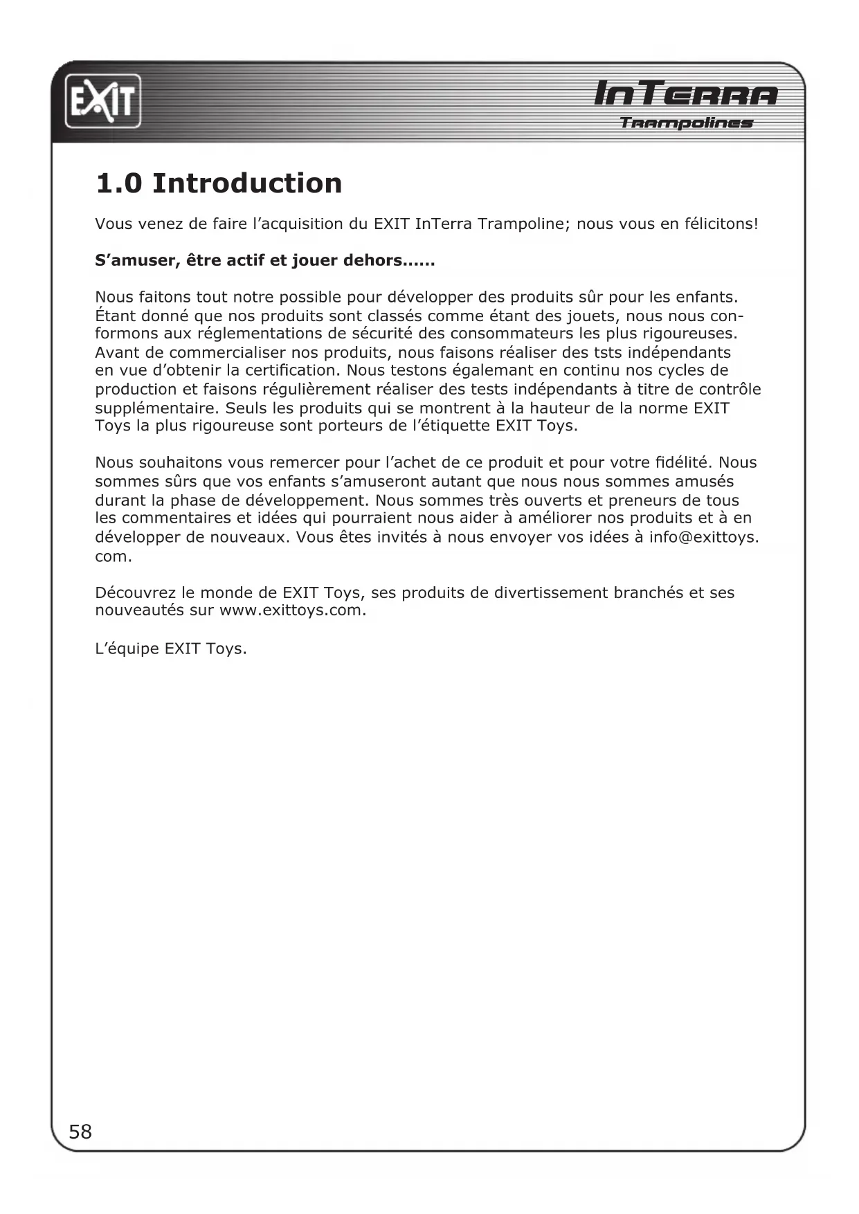 Nous souhaitons vous remercier pour l'achet de ce produit et pour votre fidélité. Nous sommes surs que vos enfants s'amuseront autant que nous nous sommesamusés durant la phase de développement. Nous sommes très ouverts et preneurs de tous les commentaires et idées qui pouraient nous aider à améliorer nos produits et à en développper de nouveaux. Vous étes invites à nous envoyer vos idées à info@exittoys. com.