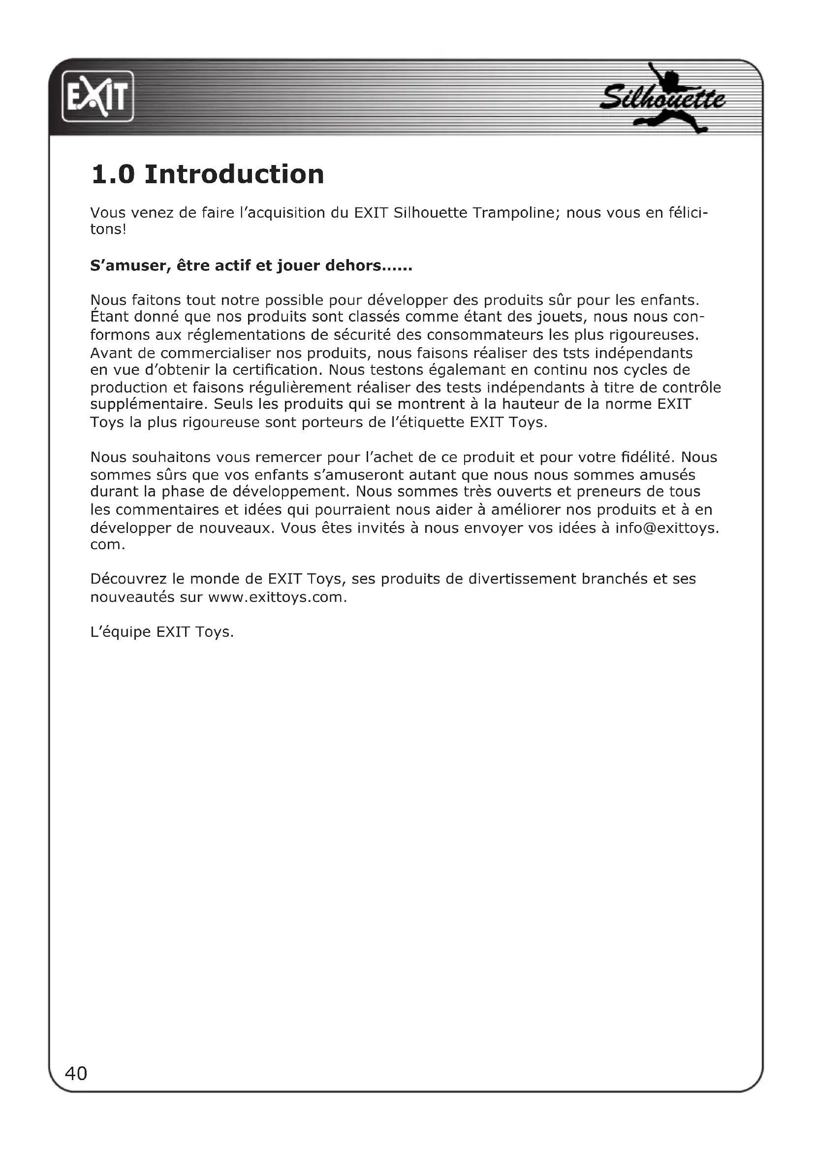 Nous souhaitons vous remercer pour l'achet de ce produit et pour votre fidélité. Nous sommes surs que vos enfants s'amuseront autant que nous nous sommesamusés durant la phase de développement. Nous sommes très ouverts et preneurs de tous les commentaires et idées qui pouraient nous aider à améliorer nos produits et à en développper de nouveaux. Vous âtes invites à nous envoyer vos idées à info@exittoys. com.