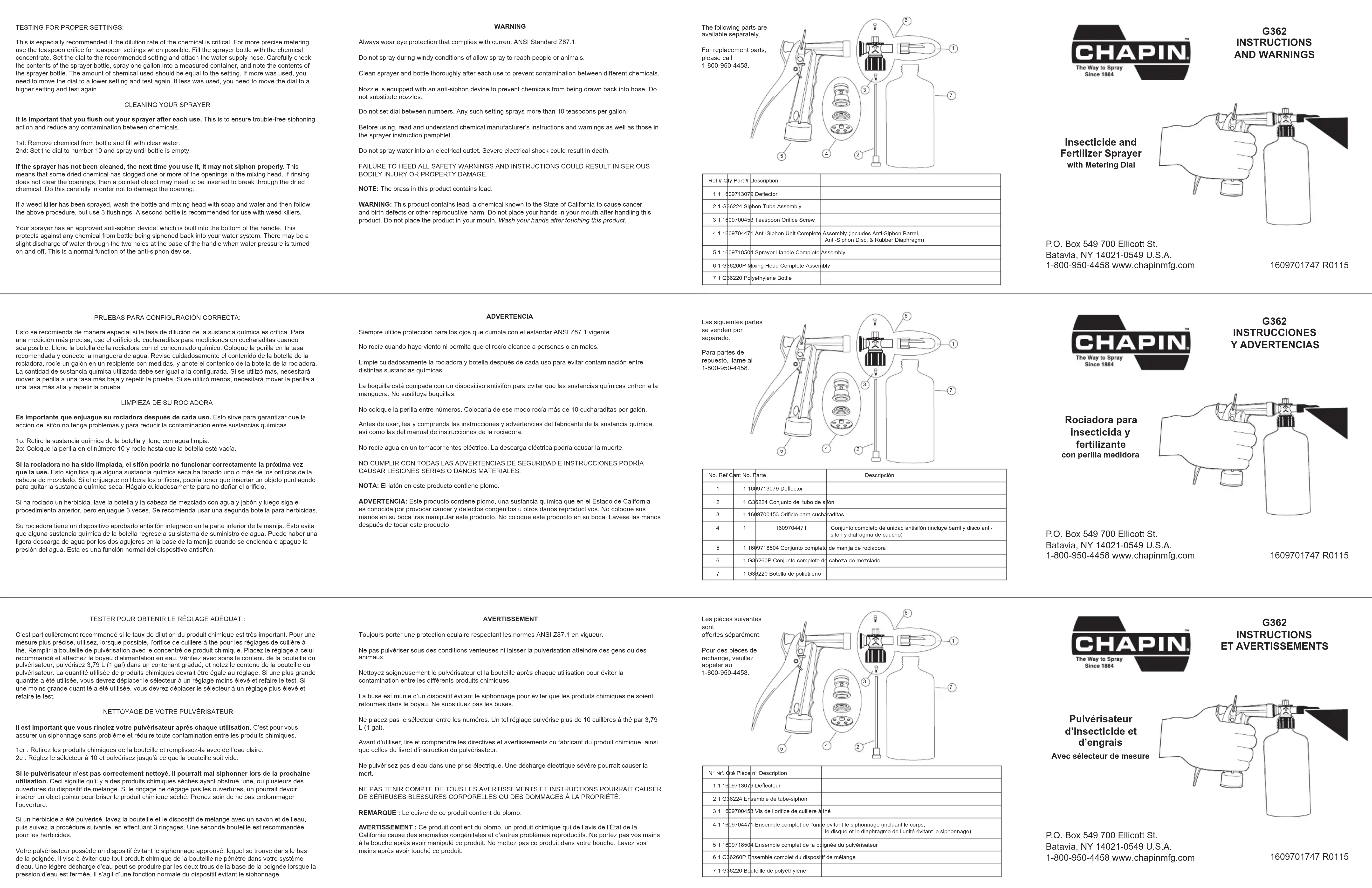 and birth defects or other reproductive harm. Do not place your hands in your mouth after handling this product. Do not place the product in your mouth. Wash your hands after touching this product. AVERTISSEMENT Toujours porter une protection oculaire respectant les normes ANSI Z87.1 en vigueur. Ne pas pulvériser sous des conditions venteuses ni laisser la pulvérisation atteindre des gens ou des animaux. Nettoyez soigneusement le pulvérisateur et la bouteille après chaque utilisation pour éviter la contamination entre les différents produits chimiques. La buse est munie d’un dispositif évitant le siphonnage pour éviter que les produits chimiques ne soient retournés dans le boyau. Ne substituez pas les buses. Ne placez pas le sélecteur entre les numéros. Un tel réglage pulvérise plus de 10 cuillères à thé par 3,79 L (1 gal). Avant d’utiliser, lire et comprendre les directives et avertissements du fabricant du produit chimique, ainsi que celles du livret d’instruction du pulvérisateur. Ne pulvérisez pas d’eau dans une prise électrique. Une décharge électrique sévère pourrait causer la mort. NE PAS TENIR COMPTE DE TOUS LES AVERTISSEMENTS ET INSTRUCTIONS POURRAIT CAUSER DE SÉRIEUSES BLESSURES CORPORELLES OU DES DOMMAGES À LA PROPRIÉTÉ. REMARQUE : Le cuivre de ce produit contient du plomb.